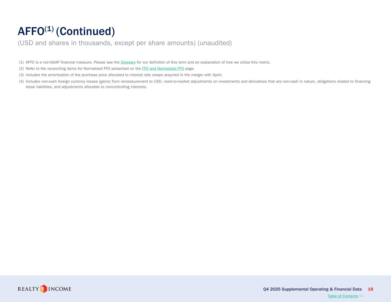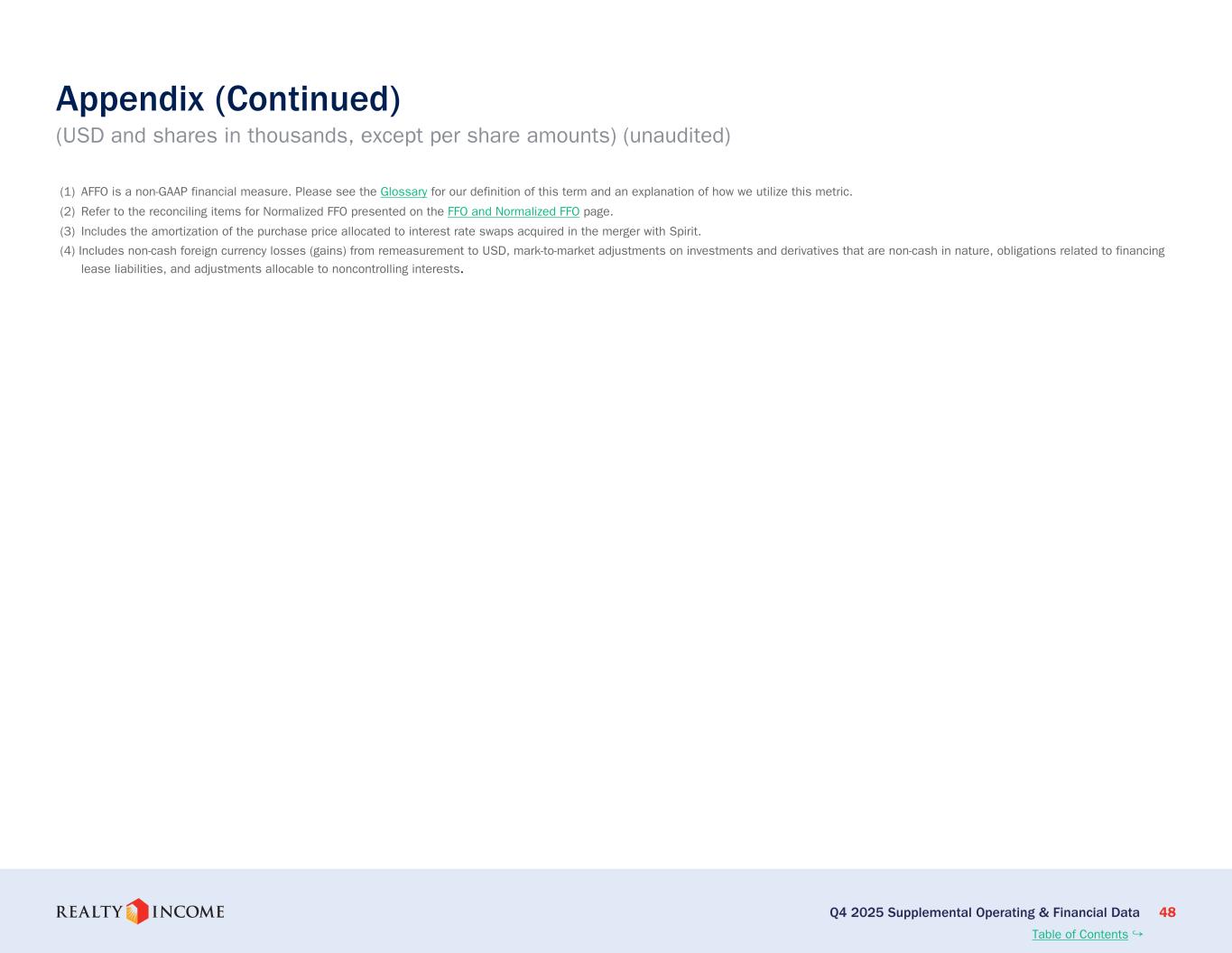 Q4 2025 Supplemental Operating & Financial Data 48 Table of Contents ↪ Appendix (Continued) (USD and shares in thousands, except per share amounts) (unaudited) (1) AFFO is a non-GAAP financial measure. Please see the Glossary for our definition of this term and an explanation of how we utilize this metric. (2) Refer to the reconciling items for Normalized FFO presented on the FFO and Normalized FFO page. (3) Includes the amortization of the purchase price allocated to interest rate swaps acquired in the merger with Spirit. (4) Includes non-cash foreign currency losses (gains) from remeasurement to USD, mark-to-market adjustments on investments and derivatives that are non-cash in nature, obligations related to financing lease liabilities, and adjustments allocable to noncontrolling interests.