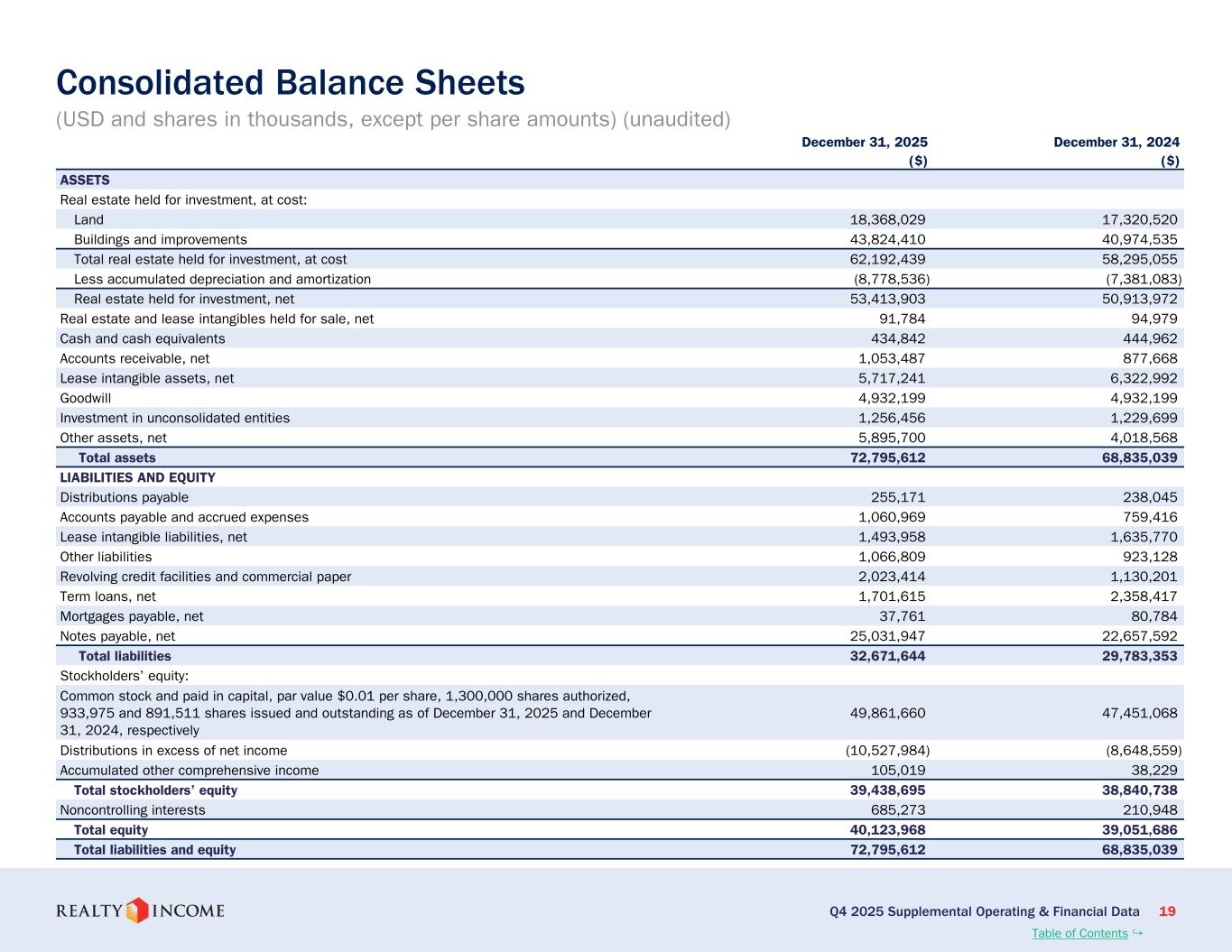 Q4 2025 Supplemental Operating & Financial Data 19 December 31, 2025 December 31, 2024 ($) ($) ASSETS Real estate held for investment, at cost:     Land 18,368,029 17,320,520 Buildings and improvements 43,824,410 40,974,535 Total real estate held for investment, at cost 62,192,439 58,295,055 Less accumulated depreciation and amortization (8,778,536) (7,381,083) Real estate held for investment, net 53,413,903 50,913,972 Real estate and lease intangibles held for sale, net 91,784 94,979 Cash and cash equivalents 434,842 444,962 Accounts receivable, net 1,053,487 877,668 Lease intangible assets, net 5,717,241 6,322,992 Goodwill 4,932,199 4,932,199 Investment in unconsolidated entities 1,256,456 1,229,699 Other assets, net 5,895,700 4,018,568 Total assets 72,795,612 68,835,039 LIABILITIES AND EQUITY Distributions payable 255,171 238,045 Accounts payable and accrued expenses 1,060,969 759,416 Lease intangible liabilities, net 1,493,958 1,635,770 Other liabilities 1,066,809 923,128 Revolving credit facilities and commercial paper 2,023,414 1,130,201 Term loans, net 1,701,615 2,358,417 Mortgages payable, net 37,761 80,784 Notes payable, net 25,031,947 22,657,592 Total liabilities 32,671,644 29,783,353 Stockholders’ equity:     Common stock and paid in capital, par value $0.01 per share, 1,300,000 shares authorized, 933,975 and 891,511 shares issued and outstanding as of December 31, 2025 and December 31, 2024, respectively 49,861,660 47,451,068 Distributions in excess of net income (10,527,984) (8,648,559) Accumulated other comprehensive income 105,019 38,229 Total stockholders’ equity 39,438,695 38,840,738 Noncontrolling interests 685,273 210,948 Total equity 40,123,968 39,051,686 Total liabilities and equity 72,795,612 68,835,039 Consolidated Balance Sheets (USD and shares in thousands, except per share amounts) (unaudited) Table of Contents ↪