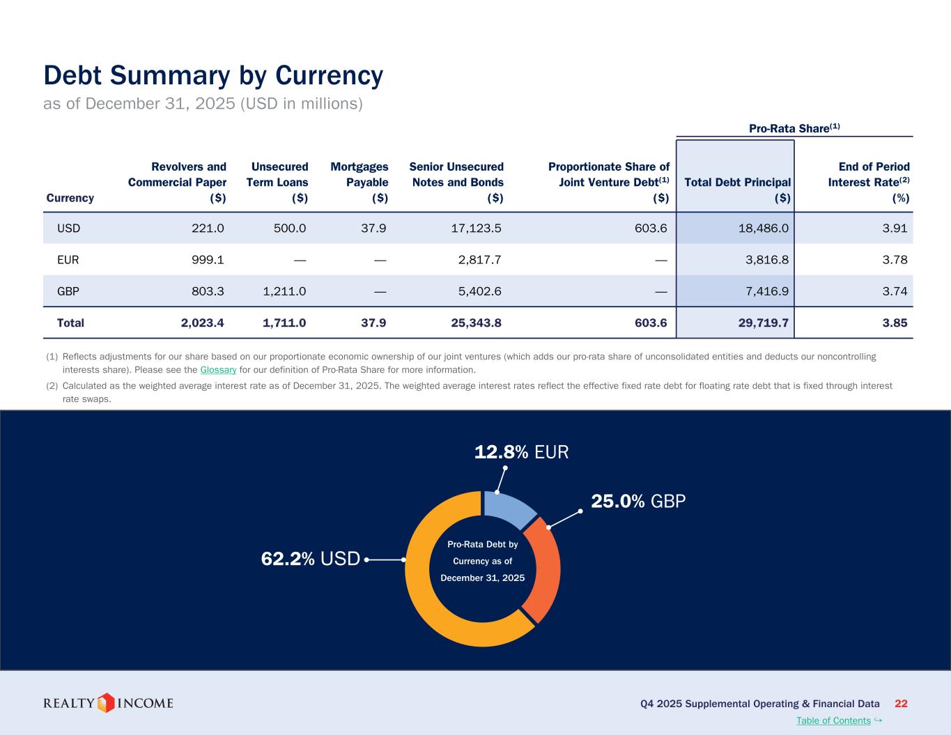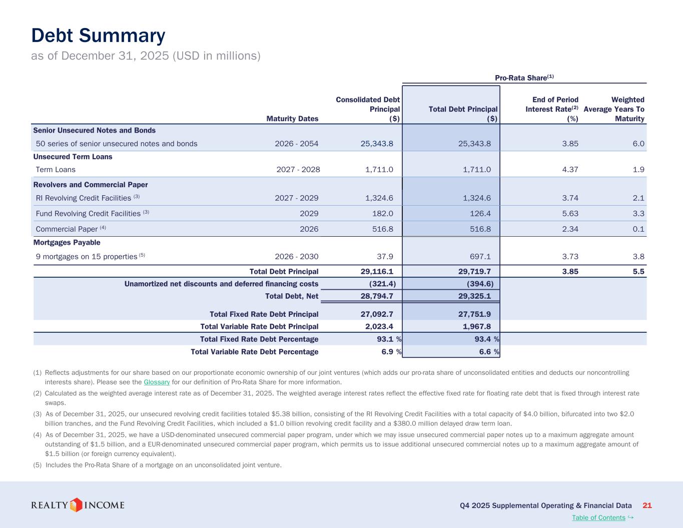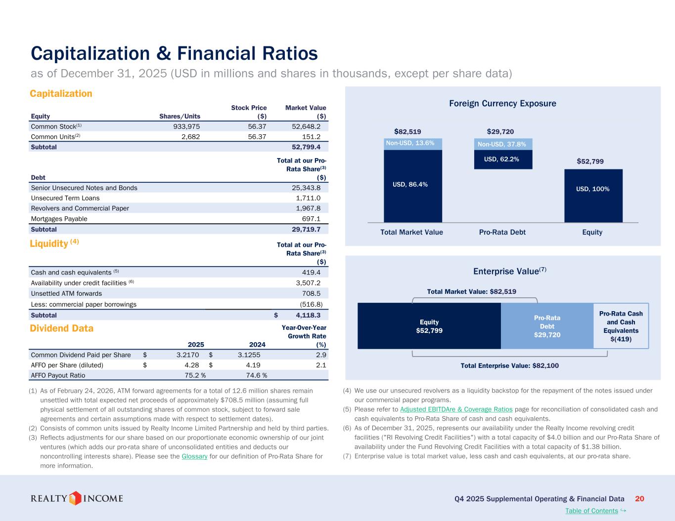 Q4 2025 Supplemental Operating & Financial Data 20 Capitalization & Financial Ratios as of December 31, 2025 (USD in millions and shares in thousands, except per share data) Capitalization Equity Shares/Units Stock Price ($) Market Value ($) Common Stock(1) 933,975 56.37 52,648.2 Common Units(2) 2,682 56.37 151.2 Subtotal 52,799.4 Debt Total at our Pro- Rata Share(3) ($) Senior Unsecured Notes and Bonds 25,343.8 Unsecured Term Loans 1,711.0 Revolvers and Commercial Paper 1,967.8 Mortgages Payable 697.1 Subtotal 29,719.7 Liquidity (4) Total at our Pro- Rata Share(3) ($) Cash and cash equivalents (5) 419.4 Availability under credit facilities (6) 3,507.2 Unsettled ATM forwards 708.5 Less: commercial paper borrowings (516.8) Subtotal $ 4,118.3 Dividend Data 2025 2024 Year-Over-Year Growth Rate (%) Common Dividend Paid per Share $ 3.2170 $ 3.1255 2.9 AFFO per Share (diluted) $ 4.28 $ 4.19 2.1 AFFO Payout Ratio 75.2 % 74.6 %   Foreign Currency Exposure Total Market Value Pro-Rata Debt Equity $82,519 $29,720 $52,799 Non-USD, 37.8%Non-USD, 13.6% USD, 62.2% USD, 86.4% USD, 100% Equity $52,799 Pro-Rata Debt $29,720 Pro-Rata Cash and Cash Equivalents $(419) Enterprise Value(7) Total Market Value: $82,519 Total Enterprise Value: $82,100 (1) As of February 24, 2026, ATM forward agreements for a total of 12.6 million shares remain unsettled with total expected net proceeds of approximately $708.5 million (assuming full physical settlement of all outstanding shares of common stock, subject to forward sale agreements and certain assumptions made with respect to settlement dates). (2) Consists of common units issued by Realty Income Limited Partnership and held by third parties. (3) Reflects adjustments for our share based on our proportionate economic ownership of our joint ventures (which adds our pro-rata share of unconsolidated entities and deducts our noncontrolling interests share). Please see the Glossary for our definition of Pro-Rata Share for more information. (4) We use our unsecured revolvers as a liquidity backstop for the repayment of the notes issued under our commercial paper programs. (5) Please refer to Adjusted EBITDAre & Coverage Ratios page for reconciliation of consolidated cash and cash equivalents to Pro-Rata Share of cash and cash equivalents. (6) As of December 31, 2025, represents our availability under the Realty Income revolving credit facilities ("RI Revolving Credit Facilities") with a total capacity of $4.0 billion and our Pro-Rata Share of availability under the Fund Revolving Credit Facilities with a total capacity of $1.38 billion. (7) Enterprise value is total market value, less cash and cash equivalents, at our pro-rata share. Table of Contents ↪