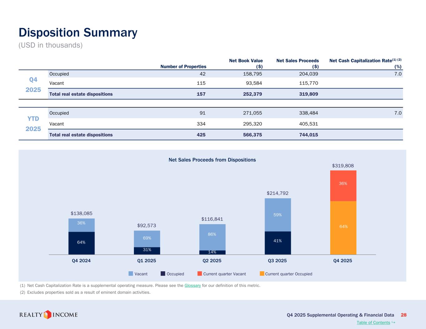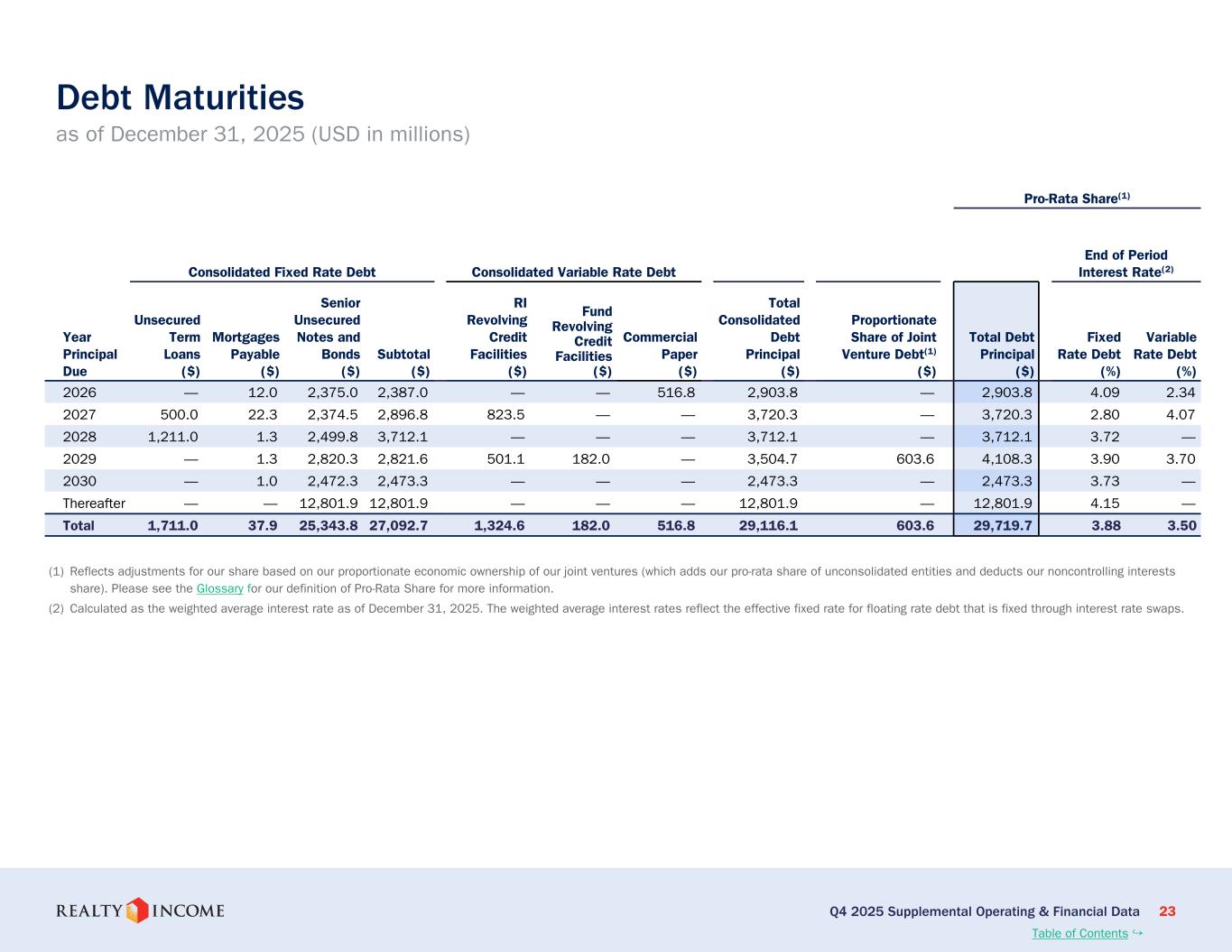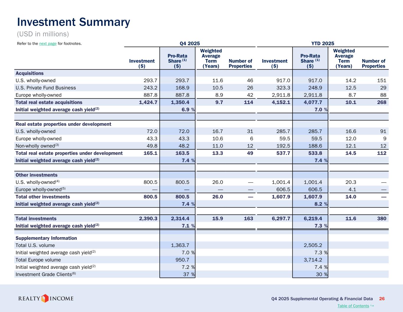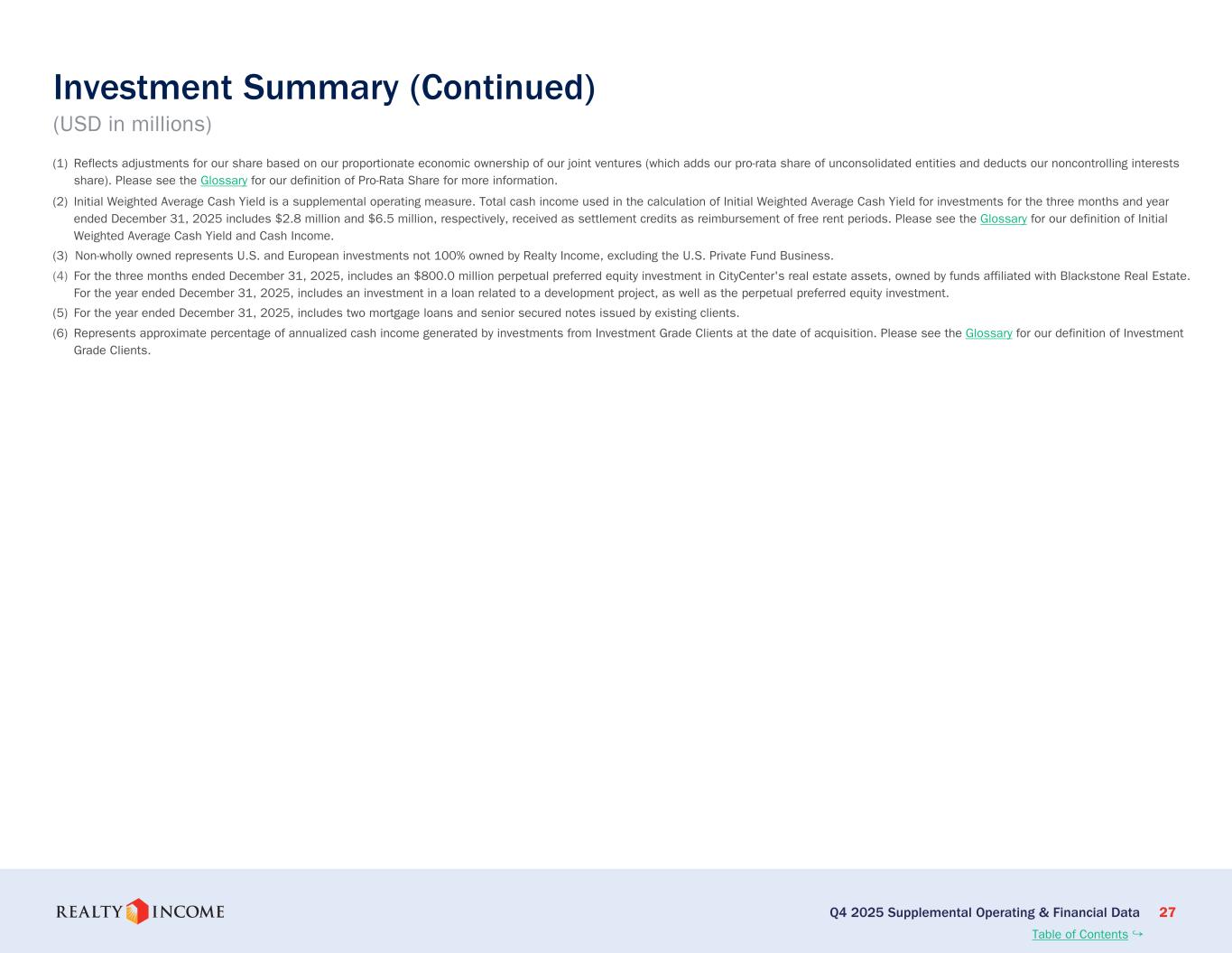 Q4 2025 Supplemental Operating & Financial Data 27 Investment Summary (Continued) (USD in millions) Table of Contents ↪ (1) Reflects adjustments for our share based on our proportionate economic ownership of our joint ventures (which adds our pro-rata share of unconsolidated entities and deducts our noncontrolling interests share). Please see the Glossary for our definition of Pro-Rata Share for more information. (2) Initial Weighted Average Cash Yield is a supplemental operating measure. Total cash income used in the calculation of Initial Weighted Average Cash Yield for investments for the three months and year ended December 31, 2025 includes $2.8 million and $6.5 million, respectively, received as settlement credits as reimbursement of free rent periods. Please see the Glossary for our definition of Initial Weighted Average Cash Yield and Cash Income. (3) Non-wholly owned represents U.S. and European investments not 100% owned by Realty Income, excluding the U.S. Private Fund Business. (4) For the three months ended December 31, 2025, includes an $800.0 million perpetual preferred equity investment in CityCenter's real estate assets, owned by funds affiliated with Blackstone Real Estate. For the year ended December 31, 2025, includes an investment in a loan related to a development project, as well as the perpetual preferred equity investment. (5) For the year ended December 31, 2025, includes two mortgage loans and senior secured notes issued by existing clients. (6) Represents approximate percentage of annualized cash income generated by investments from Investment Grade Clients at the date of acquisition. Please see the Glossary for our definition of Investment Grade Clients.