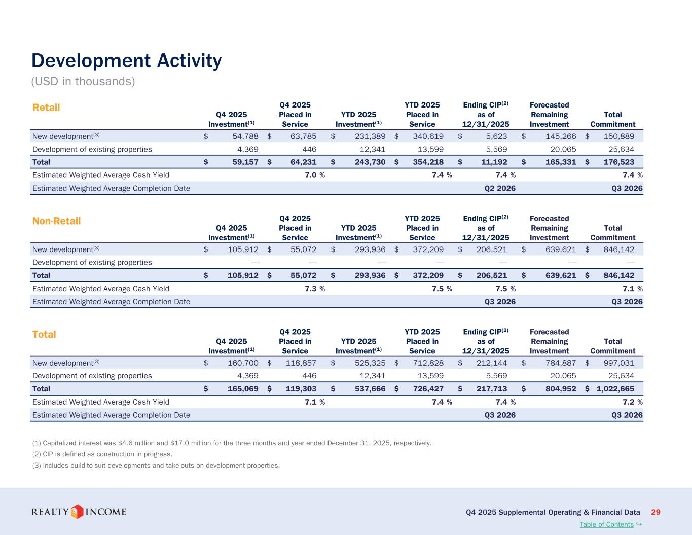 Q4 2025 Supplemental Operating & Financial Data 29 Development Activity (USD in thousands) Retail Q4 2025 Investment(1) Q4 2025 Placed in Service YTD 2025 Investment(1) YTD 2025 Placed in Service Ending CIP(2) as of 12/31/2025 Forecasted Remaining Investment Total Commitment New development(3) $ 54,788 $ 63,785 $ 231,389 $ 340,619 $ 5,623 $ 145,266 $ 150,889 Development of existing properties 4,369 446 12,341 13,599 5,569 20,065 25,634 Total $ 59,157 $ 64,231 $ 243,730 $ 354,218 $ 11,192 $ 165,331 $ 176,523 Estimated Weighted Average Cash Yield 7.0 % 7.4 % 7.4 % 7.4 % Estimated Weighted Average Completion Date Q2 2026 Q3 2026 Non-Retail Q4 2025 Investment(1) Q4 2025 Placed in Service YTD 2025 Investment(1) YTD 2025 Placed in Service Ending CIP(2) as of 12/31/2025 Forecasted Remaining Investment Total Commitment New development(3) $ 105,912 $ 55,072 $ 293,936 $ 372,209 $ 206,521 $ 639,621 $ 846,142 Development of existing properties — — — — — — — Total $ 105,912 $ 55,072 $ 293,936 $ 372,209 $ 206,521 $ 639,621 $ 846,142 Estimated Weighted Average Cash Yield 7.3 % 7.5 % 7.5 % 7.1 % Estimated Weighted Average Completion Date Q3 2026 Q3 2026 Total Q4 2025 Investment(1) Q4 2025 Placed in Service YTD 2025 Investment(1) YTD 2025 Placed in Service Ending CIP(2) as of 12/31/2025 Forecasted Remaining Investment Total Commitment New development(3) $ 160,700 $ 118,857 $ 525,325 $ 712,828 $ 212,144 $ 784,887 $ 997,031 Development of existing properties 4,369 446 12,341 13,599 5,569 20,065 25,634 Total $ 165,069 $ 119,303 $ 537,666 $ 726,427 $ 217,713 $ 804,952 $ 1,022,665 Estimated Weighted Average Cash Yield 7.1 % 7.4 % 7.4 % 7.2 % Estimated Weighted Average Completion Date Q3 2026 Q3 2026 (1) Capitalized interest was $4.6 million and $17.0 million for the three months and year ended December 31, 2025, respectively. (2) CIP is defined as construction in progress. (3) Includes build-to-suit developments and take-outs on development properties. Table of Contents ↪