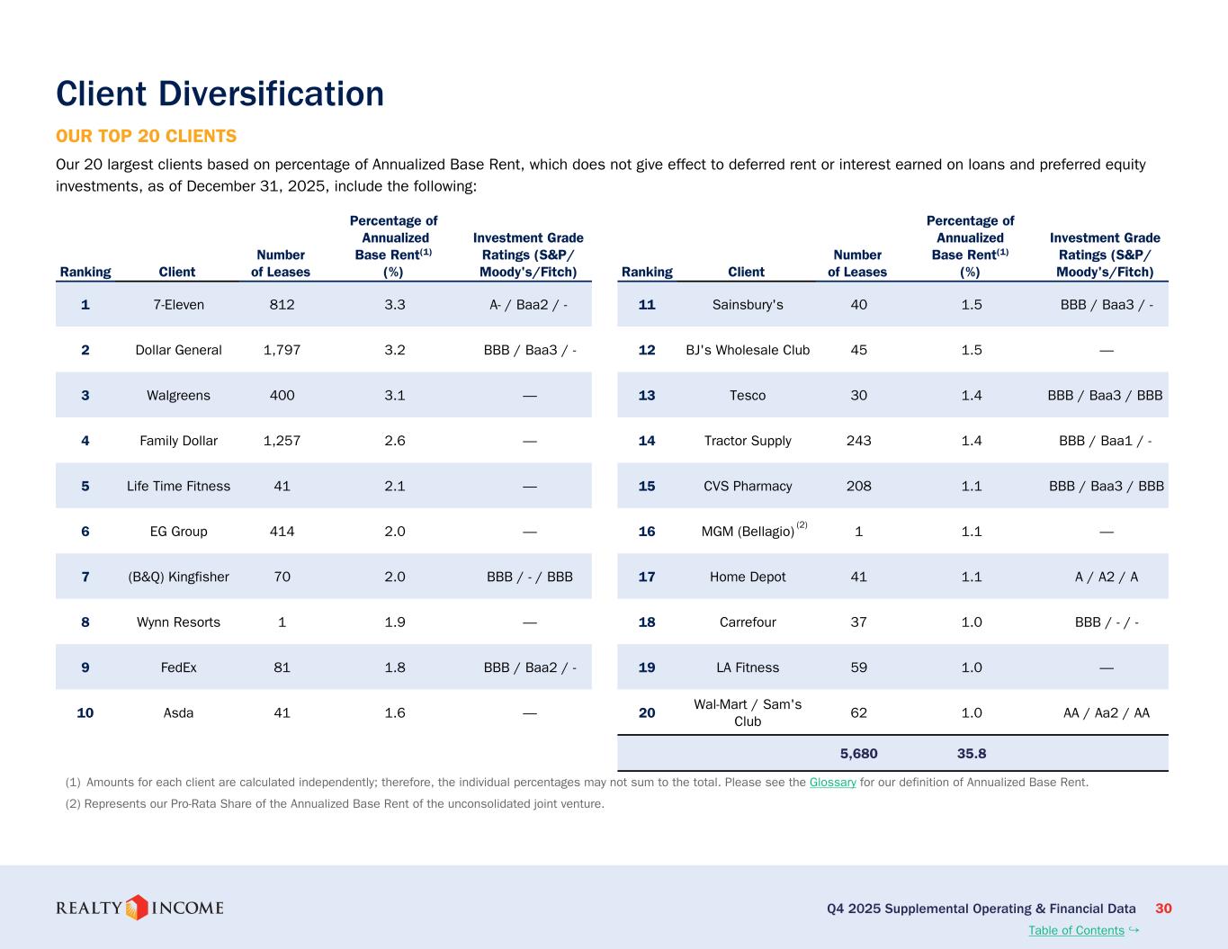 Q4 2025 Supplemental Operating & Financial Data 30 Ranking Client Number of Leases Percentage of Annualized Base Rent(1) (%) Investment Grade Ratings (S&P/ Moody's/Fitch) 1 7-Eleven 812 3.3 A- / Baa2 / - 2 Dollar General 1,797 3.2 BBB / Baa3 / - 3 Walgreens 400 3.1 — 4 Family Dollar 1,257 2.6 — 5 Life Time Fitness 41 2.1 — 6 EG Group 414 2.0 — 7 (B&Q) Kingfisher 70 2.0 BBB / - / BBB 8 Wynn Resorts 1 1.9 — 9 FedEx 81 1.8 BBB / Baa2 / - 10 Asda 41 1.6 — Client Diversification OUR TOP 20 CLIENTS Our 20 largest clients based on percentage of Annualized Base Rent, which does not give effect to deferred rent or interest earned on loans and preferred equity investments, as of December 31, 2025, include the following: (1) Amounts for each client are calculated independently; therefore, the individual percentages may not sum to the total. Please see the Glossary for our definition of Annualized Base Rent. (2) Represents our Pro-Rata Share of the Annualized Base Rent of the unconsolidated joint venture. Table of Contents ↪ Ranking Client Number of Leases Percentage of Annualized Base Rent(1) (%) Investment Grade Ratings (S&P/ Moody's/Fitch) 11 Sainsbury's 40 1.5 BBB / Baa3 / - 12 BJ's Wholesale Club 45 1.5 — 13 Tesco 30 1.4 BBB / Baa3 / BBB 14 Tractor Supply 243 1.4 BBB / Baa1 / - 15 CVS Pharmacy 208 1.1 BBB / Baa3 / BBB 16 MGM (Bellagio) 1 1.1 — 17 Home Depot 41 1.1 A / A2 / A 18 Carrefour 37 1.0 BBB / - / - 19 LA Fitness 59 1.0 — 20 Wal-Mart / Sam's Club 62 1.0 AA / Aa2 / AA 5,680 35.8 (2)