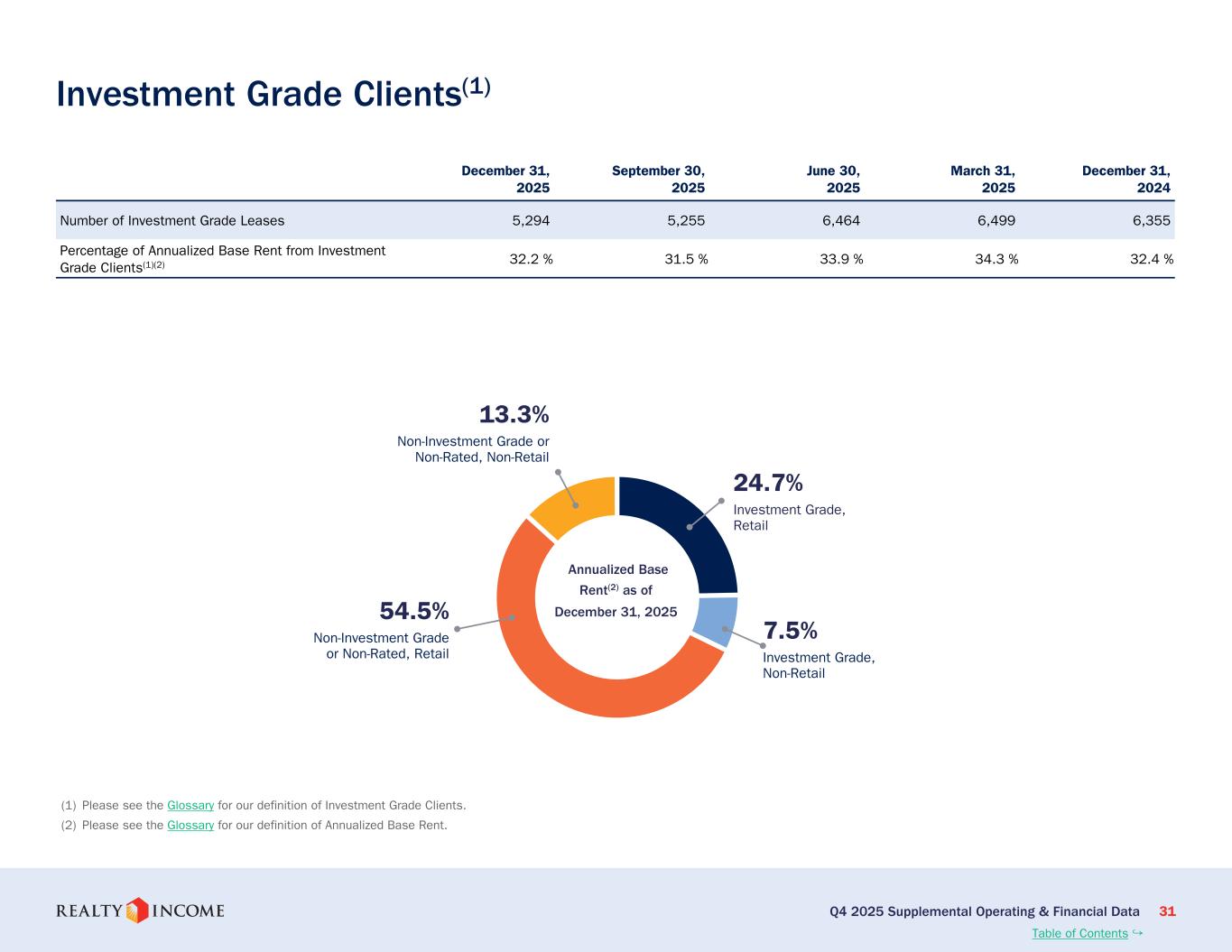 Q4 2025 Supplemental Operating & Financial Data 31 December 31, 2025 September 30, 2025 June 30, 2025 March 31, 2025 December 31, 2024 Number of Investment Grade Leases 5,294 5,255 6,464 6,499 6,355 Percentage of Annualized Base Rent from Investment Grade Clients(1)(2) 32.2 % 31.5 % 33.9 % 34.3 % 32.4 % Investment Grade Clients(1) 24.7% Investment Grade, Retail 54.5% Non-Investment Grade or Non-Rated, Retail 13.3% Non-Investment Grade or Non-Rated, Non-Retail 7.5% Investment Grade, Non-Retail (1) Please see the Glossary for our definition of Investment Grade Clients. (2) Please see the Glossary for our definition of Annualized Base Rent. Table of Contents ↪ Annualized Base Rent(2) as of December 31, 2025