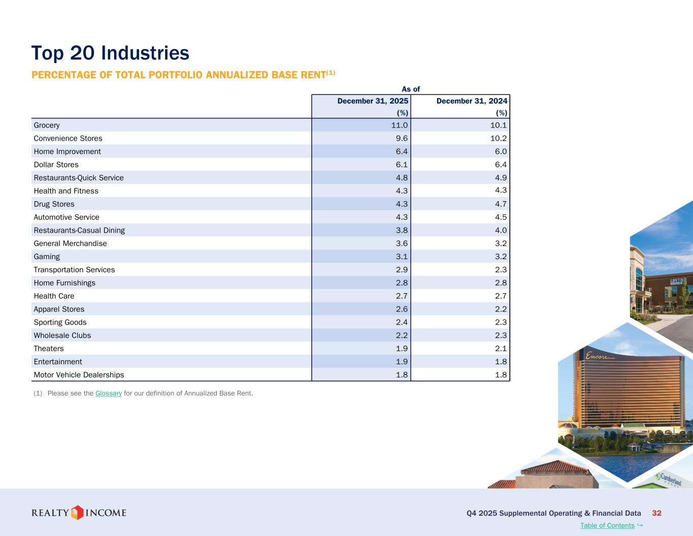 Q4 2025 Supplemental Operating & Financial Data 32 As of December 31, 2025 December 31, 2024 (%) (%) Grocery 11.0 10.1 Convenience Stores 9.6 10.2 Home Improvement 6.4 6.0 Dollar Stores 6.1 6.4 Restaurants-Quick Service 4.8 4.9 Health and Fitness 4.3 4.3 Drug Stores 4.3 4.7 Automotive Service 4.3 4.5 Restaurants-Casual Dining 3.8 4.0 General Merchandise 3.6 3.2 Gaming 3.1 3.2 Transportation Services 2.9 2.3 Home Furnishings 2.8 2.8 Health Care 2.7 2.7 Apparel Stores 2.6 2.2 Sporting Goods 2.4 2.3 Wholesale Clubs 2.2 2.3 Theaters 1.9 2.1 Entertainment 1.9 1.8 Motor Vehicle Dealerships 1.8 1.8 (1) Please see the Glossary for our definition of Annualized Base Rent. Top 20 Industries PERCENTAGE OF TOTAL PORTFOLIO ANNUALIZED BASE RENT(1) Table of Contents ↪