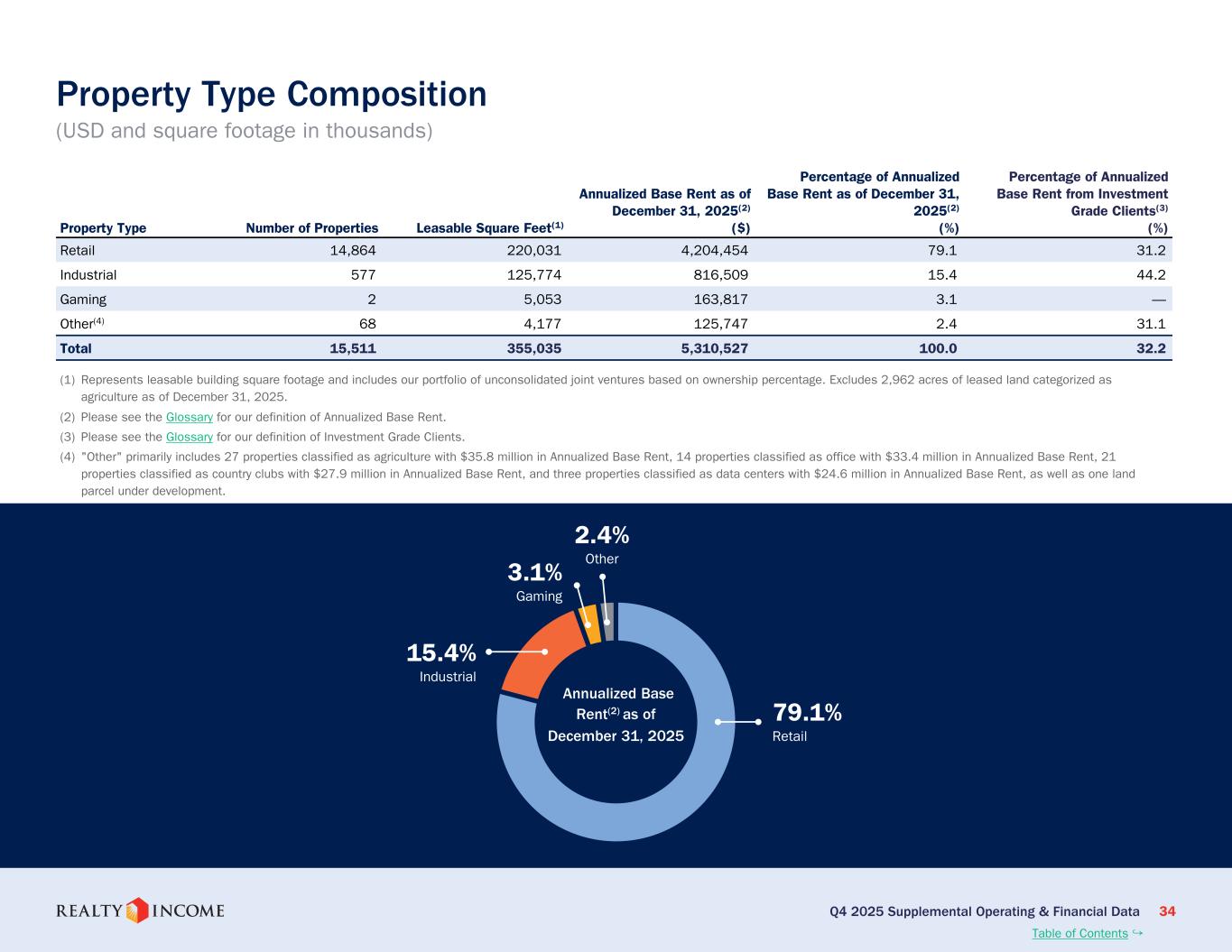 Q4 2025 Supplemental Operating & Financial Data 34 Property Type Number of Properties Leasable Square Feet(1) Annualized Base Rent as of December 31, 2025(2) ($) Percentage of Annualized Base Rent as of December 31, 2025(2) (%) Percentage of Annualized Base Rent from Investment Grade Clients(3) (%) Retail 14,864 220,031 4,204,454 79.1 31.2 Industrial 577 125,774 816,509 15.4 44.2 Gaming 2 5,053 163,817 3.1 — Other(4) 68 4,177 125,747 2.4 31.1 Total 15,511 355,035 5,310,527 100.0 32.2 (1) Represents leasable building square footage and includes our portfolio of unconsolidated joint ventures based on ownership percentage. Excludes 2,962 acres of leased land categorized as agriculture as of December 31, 2025. (2) Please see the Glossary for our definition of Annualized Base Rent. (3) Please see the Glossary for our definition of Investment Grade Clients. (4) "Other" primarily includes 27 properties classified as agriculture with $35.8 million in Annualized Base Rent, 14 properties classified as office with $33.4 million in Annualized Base Rent, 21 properties classified as country clubs with $27.9 million in Annualized Base Rent, and three properties classified as data centers with $24.6 million in Annualized Base Rent, as well as one land parcel under development. Property Type Composition (USD and square footage in thousands) 15.4% Industrial 79.1% Retail 3.1% Gaming 2.4% Other Table of Contents ↪ Annualized Base Rent(2) as of December 31, 2025