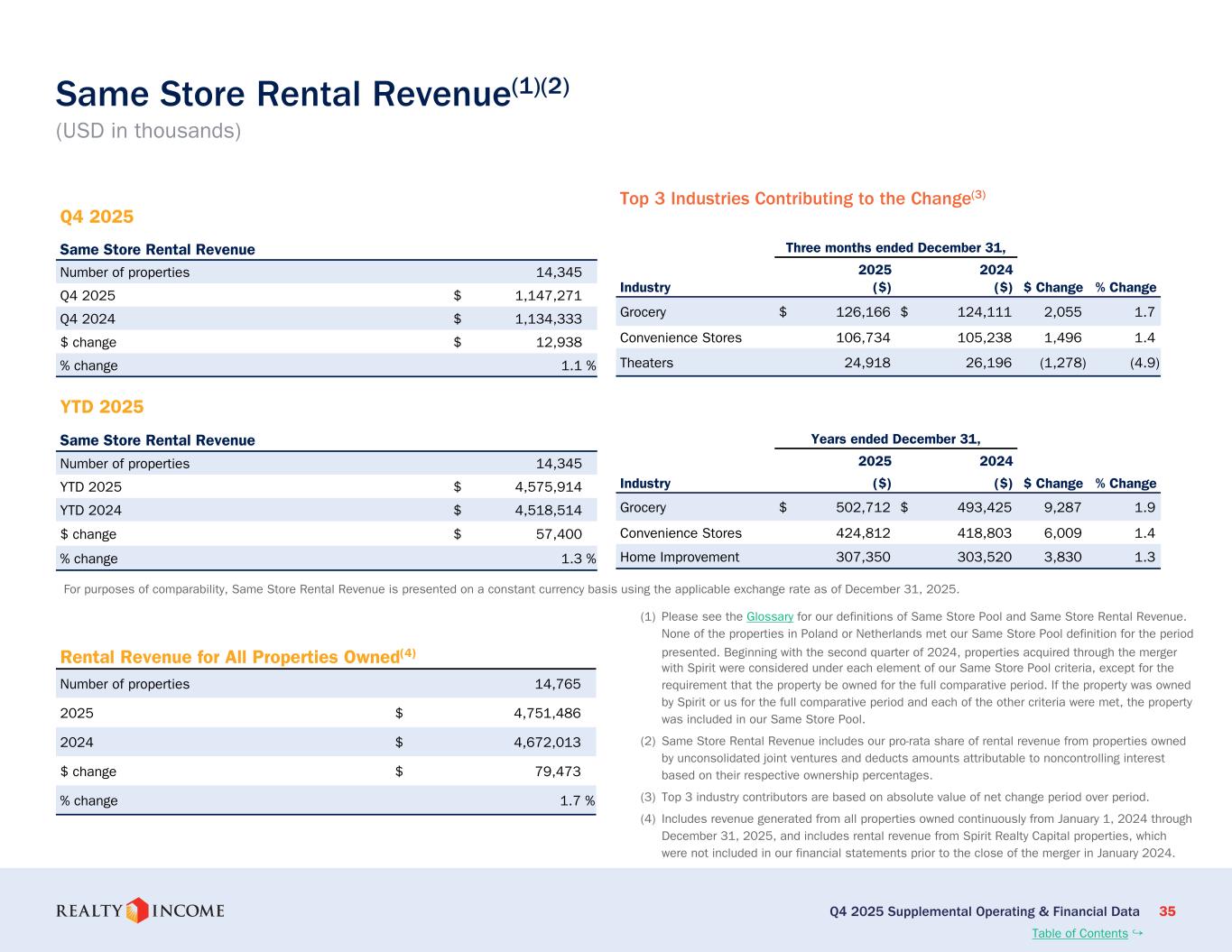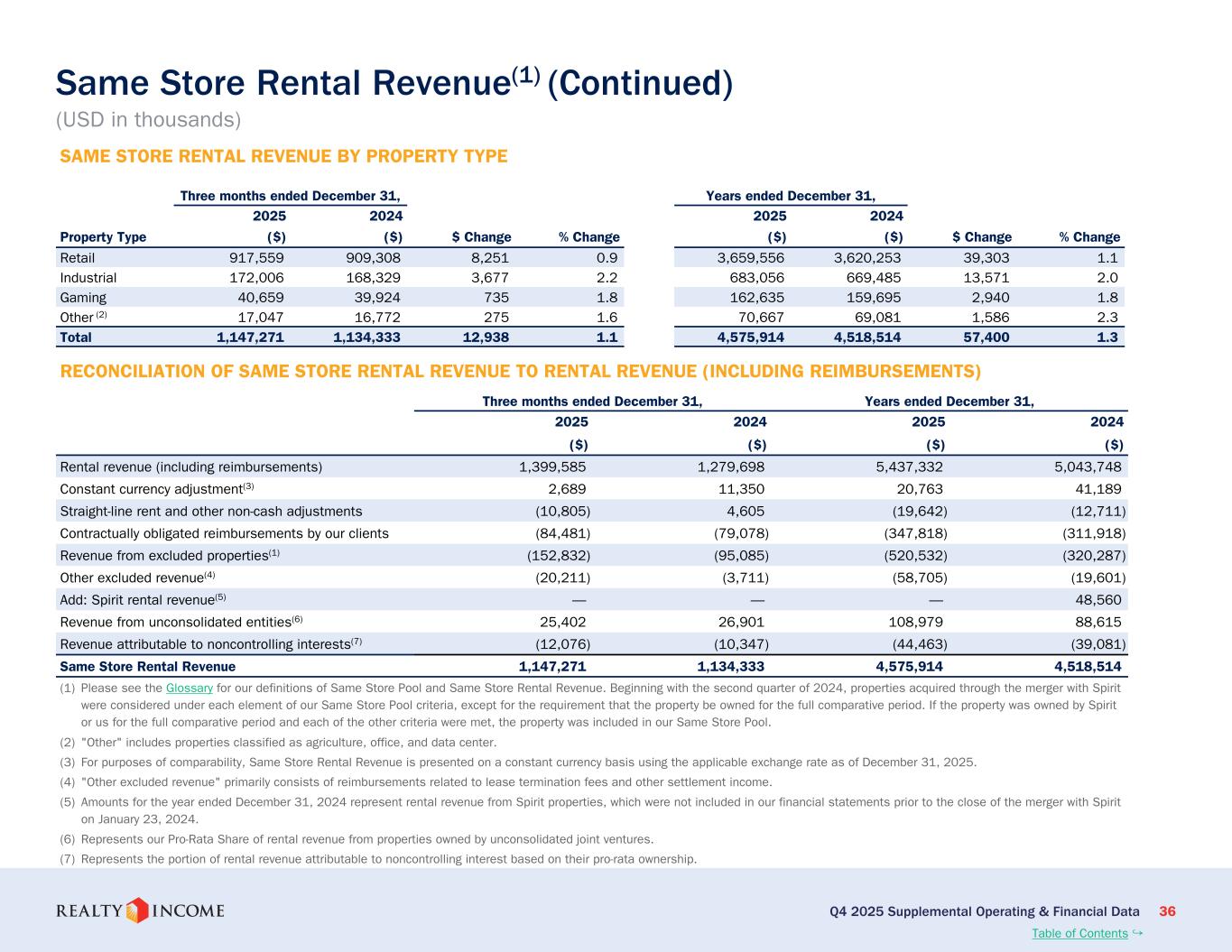 Q4 2025 Supplemental Operating & Financial Data 35 Q4 2025 Same Store Rental Revenue Number of properties 14,345 Q4 2025 $ 1,147,271 Q4 2024 $ 1,134,333 $ change $ 12,938 % change 1.1 % YTD 2025 Same Store Rental Revenue Number of properties 14,345 YTD 2025 $ 4,575,914 YTD 2024 $ 4,518,514 $ change $ 57,400 % change 1.3 % Top 3 Industries Contributing to the Change(3) Three months ended December 31, Industry 2025 2024 $ Change % Change($) ($) Grocery $ 126,166 $ 124,111 2,055 1.7 Convenience Stores 106,734 105,238 1,496 1.4 Theaters 24,918 26,196 (1,278) (4.9) Years ended December 31, Industry 2025 2024 $ Change % Change($) ($) Grocery $ 502,712 $ 493,425 9,287 1.9 Convenience Stores 424,812 418,803 6,009 1.4 Home Improvement 307,350 303,520 3,830 1.3 (1) Please see the Glossary for our definitions of Same Store Pool and Same Store Rental Revenue. None of the properties in Poland or Netherlands met our Same Store Pool definition for the period presented. Beginning with the second quarter of 2024, properties acquired through the merger with Spirit were considered under each element of our Same Store Pool criteria, except for the requirement that the property be owned for the full comparative period. If the property was owned by Spirit or us for the full comparative period and each of the other criteria were met, the property was included in our Same Store Pool. (2) Same Store Rental Revenue includes our pro-rata share of rental revenue from properties owned by unconsolidated joint ventures and deducts amounts attributable to noncontrolling interest based on their respective ownership percentages. (3) Top 3 industry contributors are based on absolute value of net change period over period. (4) Includes revenue generated from all properties owned continuously from January 1, 2024 through December 31, 2025, and includes rental revenue from Spirit Realty Capital properties, which were not included in our financial statements prior to the close of the merger in January 2024. Same Store Rental Revenue(1)(2) (USD in thousands) Table of Contents ↪ Rental Revenue for All Properties Owned(4) Number of properties 14,765 2025 $ 4,751,486 2024 $ 4,672,013 $ change $ 79,473 % change 1.7 % For purposes of comparability, Same Store Rental Revenue is presented on a constant currency basis using the applicable exchange rate as of December 31, 2025.