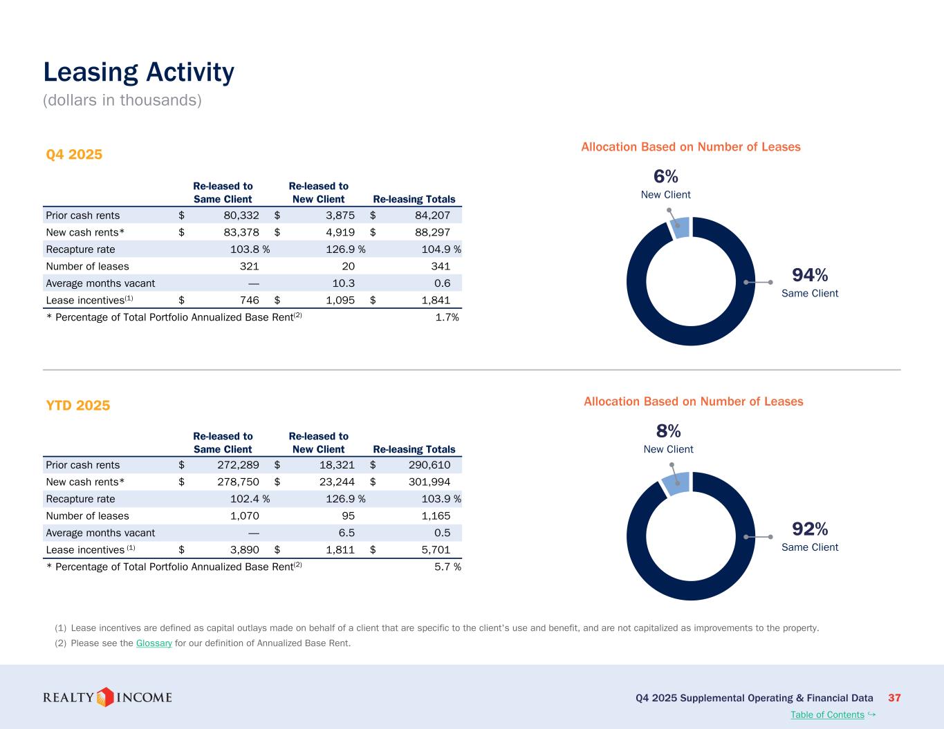 Q4 2025 Supplemental Operating & Financial Data 37 Q4 2025 Re-leased to Same Client Re-leased to New Client Re-leasing Totals Prior cash rents $ 80,332 $ 3,875 $ 84,207 New cash rents* $ 83,378 $ 4,919 $ 88,297 Recapture rate 103.8 % 126.9 % 104.9 % Number of leases 321 20 341 Average months vacant — 10.3 0.6 Lease incentives(1) $ 746 $ 1,095 $ 1,841 * Percentage of Total Portfolio Annualized Base Rent(2) 1.7% YTD 2025 Re-leased to Same Client Re-leased to New Client Re-leasing Totals Prior cash rents $ 272,289 $ 18,321 $ 290,610 New cash rents* $ 278,750 $ 23,244 $ 301,994 Recapture rate 102.4 % 126.9 % 103.9 % Number of leases 1,070 95 1,165 Average months vacant — 6.5 0.5 Lease incentives (1) $ 3,890 $ 1,811 $ 5,701 * Percentage of Total Portfolio Annualized Base Rent(2) 5.7 % Leasing Activity (dollars in thousands) Allocation Based on Number of Leases 94% Same Client 6% New Client Allocation Based on Number of Leases 8% New Client 92% Same Client (1) Lease incentives are defined as capital outlays made on behalf of a client that are specific to the client's use and benefit, and are not capitalized as improvements to the property. (2) Please see the Glossary for our definition of Annualized Base Rent. Table of Contents ↪