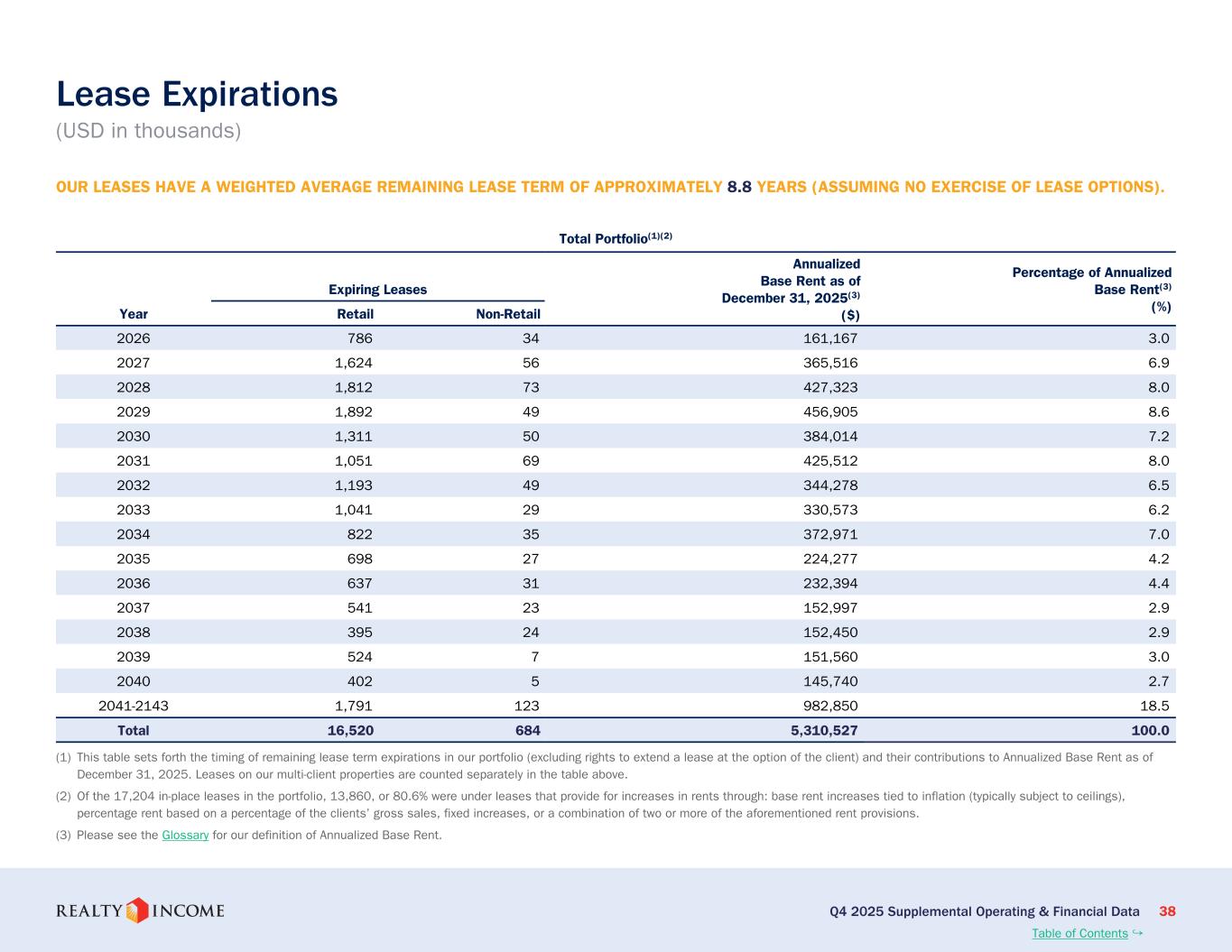 Q4 2025 Supplemental Operating & Financial Data 38 (1) This table sets forth the timing of remaining lease term expirations in our portfolio (excluding rights to extend a lease at the option of the client) and their contributions to Annualized Base Rent as of December 31, 2025. Leases on our multi-client properties are counted separately in the table above. (2) Of the 17,204 in-place leases in the portfolio, 13,860, or 80.6% were under leases that provide for increases in rents through: base rent increases tied to inflation (typically subject to ceilings), percentage rent based on a percentage of the clients’ gross sales, fixed increases, or a combination of two or more of the aforementioned rent provisions. (3) Please see the Glossary for our definition of Annualized Base Rent. OUR LEASES HAVE A WEIGHTED AVERAGE REMAINING LEASE TERM OF APPROXIMATELY 8.8 YEARS (ASSUMING NO EXERCISE OF LEASE OPTIONS). Lease Expirations (USD in thousands) Total Portfolio(1)(2) Annualized Base Rent as of December 31, 2025(3) ($) Percentage of Annualized Base Rent(3) (%) Expiring Leases Year Retail Non-Retail 2026 786 34 161,167 3.0 2027 1,624 56 365,516 6.9 2028 1,812 73 427,323 8.0 2029 1,892 49 456,905 8.6 2030 1,311 50 384,014 7.2 2031 1,051 69 425,512 8.0 2032 1,193 49 344,278 6.5 2033 1,041 29 330,573 6.2 2034 822 35 372,971 7.0 2035 698 27 224,277 4.2 2036 637 31 232,394 4.4 2037 541 23 152,997 2.9 2038 395 24 152,450 2.9 2039 524 7 151,560 3.0 2040 402 5 145,740 2.7 2041-2143 1,791 123 982,850 18.5 Total 16,520 684 5,310,527 100.0 Table of Contents ↪