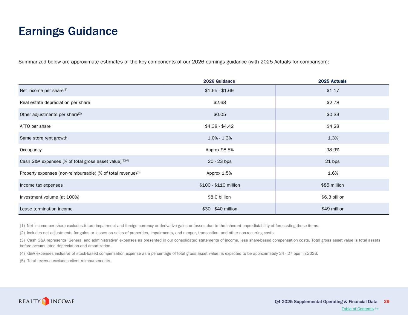 Q4 2025 Supplemental Operating & Financial Data 39 Earnings Guidance 2026 Guidance 2025 Actuals Net income per share(1) $1.65 - $1.69 $1.17 Real estate depreciation per share $2.68 $2.78 Other adjustments per share(2) $0.05 $0.33 AFFO per share $4.38 - $4.42 $4.28 Same store rent growth 1.0% - 1.3% 1.3% Occupancy Approx 98.5% 98.9% Cash G&A expenses (% of total gross asset value)(3)(4) 20 - 23 bps 21 bps Property expenses (non-reimbursable) (% of total revenue)(5) Approx 1.5% 1.6% Income tax expenses $100 - $110 million $85 million Investment volume (at 100%) $8.0 billion $6.3 billion Lease termination income $30 - $40 million $49 million (1) Net income per share excludes future impairment and foreign currency or derivative gains or losses due to the inherent unpredictability of forecasting these items. (2) Includes net adjustments for gains or losses on sales of properties, impairments, and merger, transaction, and other non-recurring costs. (3) Cash G&A represents 'General and administrative' expenses as presented in our consolidated statements of income, less share-based compensation costs. Total gross asset value is total assets before accumulated depreciation and amortization. (4) G&A expenses inclusive of stock-based compensation expense as a percentage of total gross asset value, is expected to be approximately 24 - 27 bps in 2026. (5) Total revenue excludes client reimbursements. Summarized below are approximate estimates of the key components of our 2026 earnings guidance (with 2025 Actuals for comparison): Table of Contents ↪