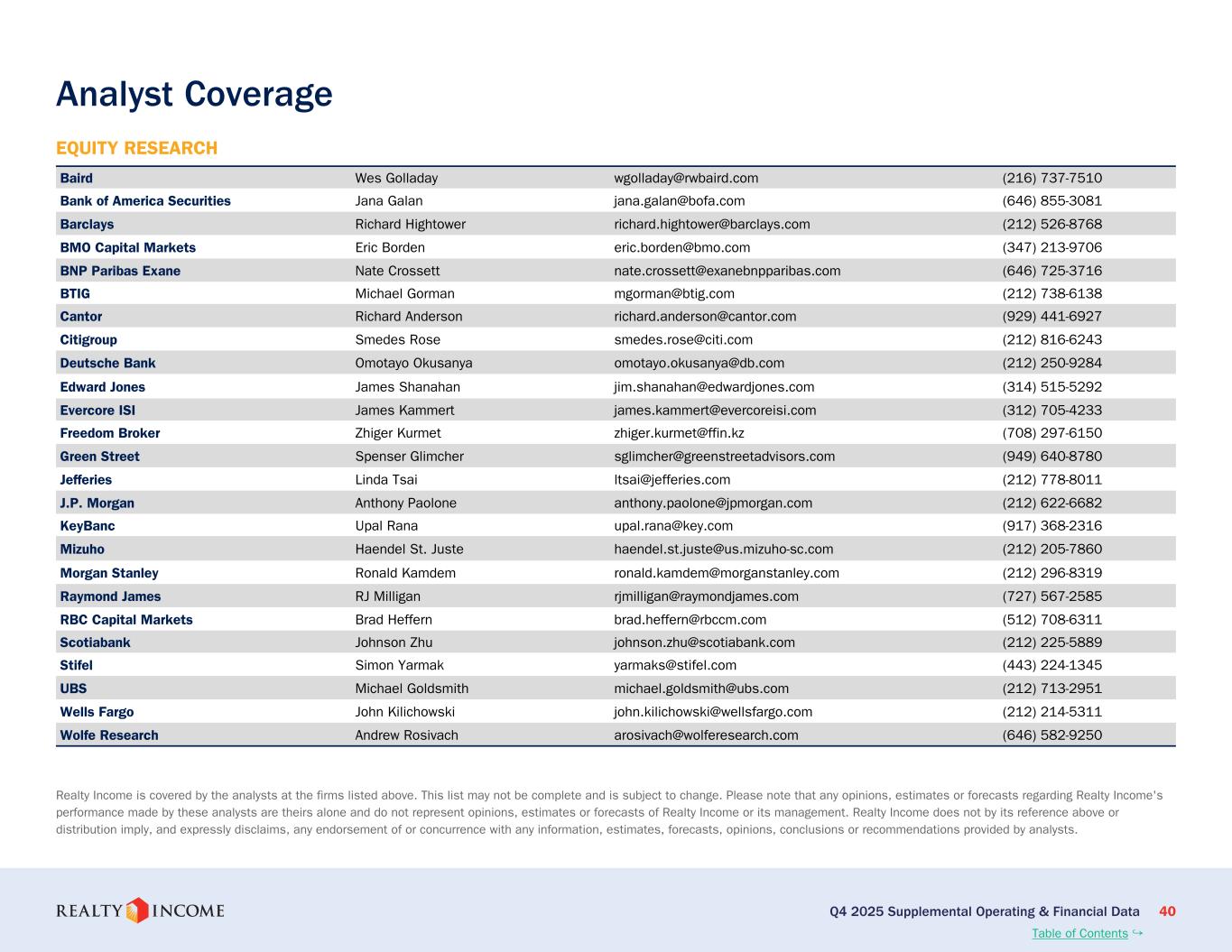 Q4 2025 Supplemental Operating & Financial Data 40 Baird Wes Golladay wgolladay@rwbaird.com (216) 737-7510 Bank of America Securities Jana Galan jana.galan@bofa.com (646) 855-3081 Barclays Richard Hightower richard.hightower@barclays.com (212) 526-8768 BMO Capital Markets Eric Borden eric.borden@bmo.com (347) 213-9706 BNP Paribas Exane Nate Crossett nate.crossett@exanebnpparibas.com (646) 725-3716 BTIG Michael Gorman mgorman@btig.com (212) 738-6138 Cantor Richard Anderson richard.anderson@cantor.com (929) 441-6927 Citigroup Smedes Rose smedes.rose@citi.com (212) 816-6243 Deutsche Bank Omotayo Okusanya omotayo.okusanya@db.com (212) 250-9284 Edward Jones James Shanahan jim.shanahan@edwardjones.com (314) 515-5292 Evercore ISI James Kammert james.kammert@evercoreisi.com (312) 705-4233 Freedom Broker Zhiger Kurmet zhiger.kurmet@ffin.kz (708) 297-6150 Green Street Spenser Glimcher sglimcher@greenstreetadvisors.com (949) 640-8780 Jefferies Linda Tsai ltsai@jefferies.com (212) 778-8011 J.P. Morgan Anthony Paolone anthony.paolone@jpmorgan.com (212) 622-6682 KeyBanc Upal Rana upal.rana@key.com (917) 368-2316 Mizuho Haendel St. Juste haendel.st.juste@us.mizuho-sc.com (212) 205-7860 Morgan Stanley Ronald Kamdem ronald.kamdem@morganstanley.com (212) 296-8319 Raymond James RJ Milligan rjmilligan@raymondjames.com (727) 567-2585 RBC Capital Markets Brad Heffern brad.heffern@rbccm.com (512) 708-6311 Scotiabank Johnson Zhu johnson.zhu@scotiabank.com (212) 225-5889 Stifel Simon Yarmak yarmaks@stifel.com (443) 224-1345 UBS Michael Goldsmith michael.goldsmith@ubs.com (212) 713-2951 Wells Fargo John Kilichowski john.kilichowski@wellsfargo.com (212) 214-5311 Wolfe Research Andrew Rosivach arosivach@wolferesearch.com (646) 582-9250 Realty Income is covered by the analysts at the firms listed above. This list may not be complete and is subject to change. Please note that any opinions, estimates or forecasts regarding Realty Income's performance made by these analysts are theirs alone and do not represent opinions, estimates or forecasts of Realty Income or its management. Realty Income does not by its reference above or distribution imply, and expressly disclaims, any endorsement of or concurrence with any information, estimates, forecasts, opinions, conclusions or recommendations provided by analysts. Analyst Coverage EQUITY RESEARCH Table of Contents ↪