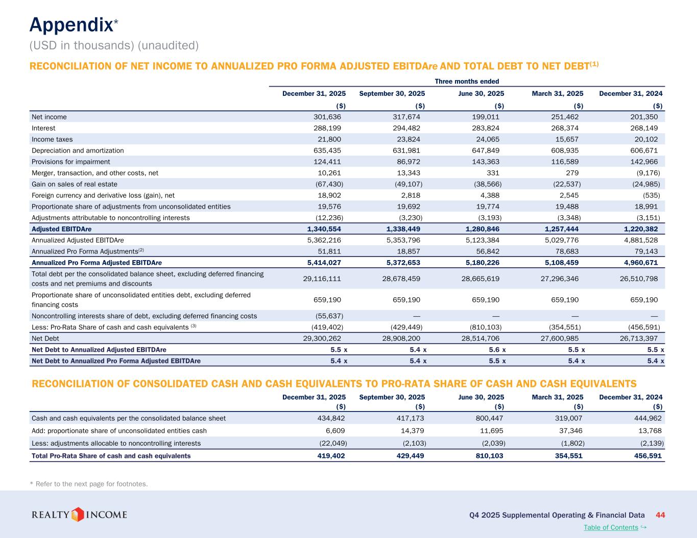 Q4 2025 Supplemental Operating & Financial Data 44 Appendix* (USD in thousands) (unaudited) Table of Contents ↪ Three months ended December 31, 2025 September 30, 2025 June 30, 2025 March 31, 2025 December 31, 2024 ($) ($) ($) ($) ($) Net income 301,636 317,674 199,011 251,462 201,350 Interest 288,199 294,482 283,824 268,374 268,149 Income taxes 21,800 23,824 24,065 15,657 20,102 Depreciation and amortization 635,435 631,981 647,849 608,935 606,671 Provisions for impairment 124,411 86,972 143,363 116,589 142,966 Merger, transaction, and other costs, net 10,261 13,343 331 279 (9,176) Gain on sales of real estate (67,430) (49,107) (38,566) (22,537) (24,985) Foreign currency and derivative loss (gain), net 18,902 2,818 4,388 2,545 (535) Proportionate share of adjustments from unconsolidated entities 19,576 19,692 19,774 19,488 18,991 Adjustments attributable to noncontrolling interests (12,236) (3,230) (3,193) (3,348) (3,151) Adjusted EBITDAre 1,340,554 1,338,449 1,280,846 1,257,444 1,220,382 Annualized Adjusted EBITDAre 5,362,216 5,353,796 5,123,384 5,029,776 4,881,528 Annualized Pro Forma Adjustments(2) 51,811 18,857 56,842 78,683 79,143 Annualized Pro Forma Adjusted EBITDAre 5,414,027 5,372,653 5,180,226 5,108,459 4,960,671 Total debt per the consolidated balance sheet, excluding deferred financing costs and net premiums and discounts 29,116,111 28,678,459 28,665,619 27,296,346 26,510,798 Proportionate share of unconsolidated entities debt, excluding deferred financing costs 659,190 659,190 659,190 659,190 659,190 Noncontrolling interests share of debt, excluding deferred financing costs (55,637) — — — — Less: Pro-Rata Share of cash and cash equivalents (3) (419,402) (429,449) (810,103) (354,551) (456,591) Net Debt 29,300,262 28,908,200 28,514,706 27,600,985 26,713,397 Net Debt to Annualized Adjusted EBITDAre 5.5 x 5.4 x 5.6 x 5.5 x 5.5 x Net Debt to Annualized Pro Forma Adjusted EBITDAre 5.4 x 5.4 x 5.5 x 5.4 x 5.4 x RECONCILIATION OF NET INCOME TO ANNUALIZED PRO FORMA ADJUSTED EBITDAre AND TOTAL DEBT TO NET DEBT(1) RECONCILIATION OF CONSOLIDATED CASH AND CASH EQUIVALENTS TO PRO-RATA SHARE OF CASH AND CASH EQUIVALENTS December 31, 2025 September 30, 2025 June 30, 2025 March 31, 2025 December 31, 2024 ($) ($) ($) ($) ($) Cash and cash equivalents per the consolidated balance sheet 434,842 417,173 800,447 319,007 444,962 Add: proportionate share of unconsolidated entities cash 6,609 14,379 11,695 37,346 13,768 Less: adjustments allocable to noncontrolling interests (22,049) (2,103) (2,039) (1,802) (2,139) Total Pro-Rata Share of cash and cash equivalents 419,402 429,449 810,103 354,551 456,591 * Refer to the next page for footnotes.