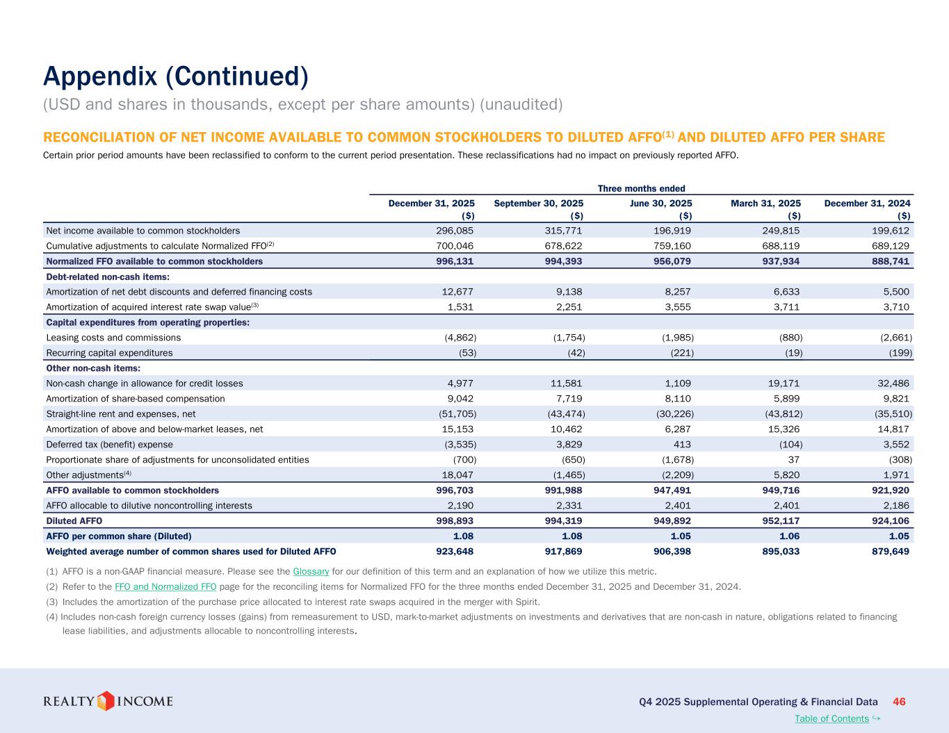 Q4 2025 Supplemental Operating & Financial Data 46 Appendix (Continued) (USD and shares in thousands, except per share amounts) (unaudited) Table of Contents ↪ RECONCILIATION OF NET INCOME AVAILABLE TO COMMON STOCKHOLDERS TO DILUTED AFFO(1) AND DILUTED AFFO PER SHARE Three months ended   December 31, 2025 September 30, 2025 June 30, 2025 March 31, 2025 December 31, 2024 ($) ($) ($) ($) ($) Net income available to common stockholders 296,085 315,771 196,919 249,815 199,612 Cumulative adjustments to calculate Normalized FFO(2) 700,046 678,622 759,160 688,119 689,129 Normalized FFO available to common stockholders 996,131 994,393 956,079 937,934 888,741 Debt-related non-cash items: Amortization of net debt discounts and deferred financing costs 12,677 9,138 8,257 6,633 5,500 Amortization of acquired interest rate swap value(3) 1,531 2,251 3,555 3,711 3,710 Capital expenditures from operating properties: Leasing costs and commissions (4,862) (1,754) (1,985) (880) (2,661) Recurring capital expenditures (53) (42) (221) (19) (199) Other non-cash items: Non-cash change in allowance for credit losses 4,977 11,581 1,109 19,171 32,486 Amortization of share-based compensation 9,042 7,719 8,110 5,899 9,821 Straight-line rent and expenses, net (51,705) (43,474) (30,226) (43,812) (35,510) Amortization of above and below-market leases, net 15,153 10,462 6,287 15,326 14,817 Deferred tax (benefit) expense (3,535) 3,829 413 (104) 3,552 Proportionate share of adjustments for unconsolidated entities (700) (650) (1,678) 37 (308) Other adjustments(4) 18,047 (1,465) (2,209) 5,820 1,971 AFFO available to common stockholders 996,703 991,988 947,491 949,716 921,920 AFFO allocable to dilutive noncontrolling interests 2,190 2,331 2,401 2,401 2,186 Diluted AFFO 998,893 994,319 949,892 952,117 924,106 AFFO per common share (Diluted) 1.08 1.08 1.05 1.06 1.05 Weighted average number of common shares used for Diluted AFFO 923,648 917,869 906,398 895,033 879,649 (1) AFFO is a non-GAAP financial measure. Please see the Glossary for our definition of this term and an explanation of how we utilize this metric. (2) Refer to the FFO and Normalized FFO page for the reconciling items for Normalized FFO for the three months ended December 31, 2025 and December 31, 2024. (3) Includes the amortization of the purchase price allocated to interest rate swaps acquired in the merger with Spirit. (4) Includes non-cash foreign currency losses (gains) from remeasurement to USD, mark-to-market adjustments on investments and derivatives that are non-cash in nature, obligations related to financing lease liabilities, and adjustments allocable to noncontrolling interests. Certain prior period amounts have been reclassified to conform to the current period presentation. These reclassifications had no impact on previously reported AFFO.