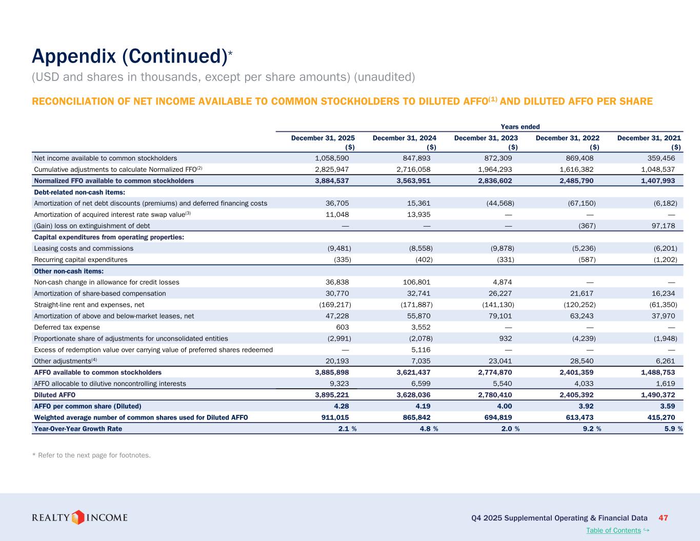 Q4 2025 Supplemental Operating & Financial Data 47 Appendix (Continued)* (USD and shares in thousands, except per share amounts) (unaudited) Table of Contents ↪ Years ended   December 31, 2025 December 31, 2024 December 31, 2023 December 31, 2022 December 31, 2021 ($) ($) ($) ($) ($) Net income available to common stockholders 1,058,590 847,893 872,309 869,408 359,456 Cumulative adjustments to calculate Normalized FFO(2) 2,825,947 2,716,058 1,964,293 1,616,382 1,048,537 Normalized FFO available to common stockholders 3,884,537 3,563,951 2,836,602 2,485,790 1,407,993 Debt-related non-cash items: Amortization of net debt discounts (premiums) and deferred financing costs 36,705 15,361 (44,568) (67,150) (6,182) Amortization of acquired interest rate swap value(3) 11,048 13,935 — — — (Gain) loss on extinguishment of debt — — — (367) 97,178 Capital expenditures from operating properties: Leasing costs and commissions (9,481) (8,558) (9,878) (5,236) (6,201) Recurring capital expenditures (335) (402) (331) (587) (1,202) Other non-cash items: Non-cash change in allowance for credit losses 36,838 106,801 4,874 — — Amortization of share-based compensation 30,770 32,741 26,227 21,617 16,234 Straight-line rent and expenses, net (169,217) (171,887) (141,130) (120,252) (61,350) Amortization of above and below-market leases, net 47,228 55,870 79,101 63,243 37,970 Deferred tax expense 603 3,552 — — — Proportionate share of adjustments for unconsolidated entities (2,991) (2,078) 932 (4,239) (1,948) Excess of redemption value over carrying value of preferred shares redeemed — 5,116 — — — Other adjustments(4) 20,193 7,035 23,041 28,540 6,261 AFFO available to common stockholders 3,885,898 3,621,437 2,774,870 2,401,359 1,488,753 AFFO allocable to dilutive noncontrolling interests 9,323 6,599 5,540 4,033 1,619 Diluted AFFO 3,895,221 3,628,036 2,780,410 2,405,392 1,490,372 AFFO per common share (Diluted) 4.28 4.19 4.00 3.92 3.59 Weighted average number of common shares used for Diluted AFFO 911,015 865,842 694,819 613,473 415,270 Year-Over-Year Growth Rate 2.1 % 4.8 % 2.0 % 9.2 % 5.9 % RECONCILIATION OF NET INCOME AVAILABLE TO COMMON STOCKHOLDERS TO DILUTED AFFO(1) AND DILUTED AFFO PER SHARE * Refer to the next page for footnotes.
