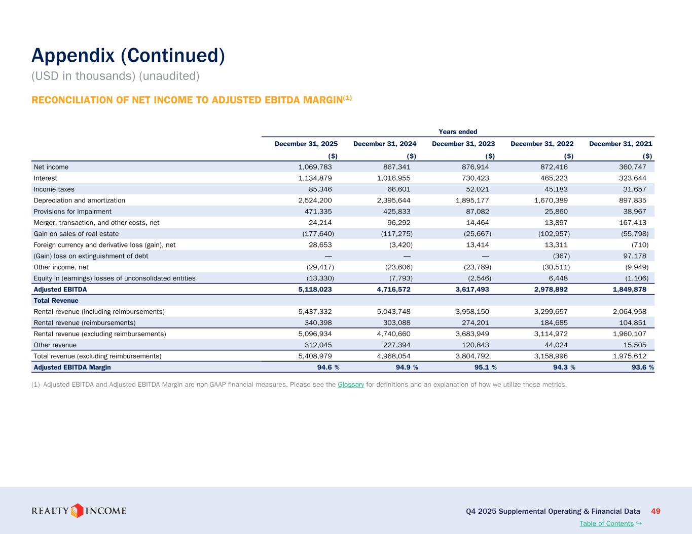 Q4 2025 Supplemental Operating & Financial Data 49 Appendix (Continued) (USD in thousands) (unaudited) Table of Contents ↪ Years ended December 31, 2025 December 31, 2024 December 31, 2023 December 31, 2022 December 31, 2021 ($) ($) ($) ($) ($) Net income 1,069,783 867,341 876,914 872,416 360,747 Interest 1,134,879 1,016,955 730,423 465,223 323,644 Income taxes 85,346 66,601 52,021 45,183 31,657 Depreciation and amortization 2,524,200 2,395,644 1,895,177 1,670,389 897,835 Provisions for impairment 471,335 425,833 87,082 25,860 38,967 Merger, transaction, and other costs, net 24,214 96,292 14,464 13,897 167,413 Gain on sales of real estate (177,640) (117,275) (25,667) (102,957) (55,798) Foreign currency and derivative loss (gain), net 28,653 (3,420) 13,414 13,311 (710) (Gain) loss on extinguishment of debt — — — (367) 97,178 Other income, net (29,417) (23,606) (23,789) (30,511) (9,949) Equity in (earnings) losses of unconsolidated entities (13,330) (7,793) (2,546) 6,448 (1,106) Adjusted EBITDA 5,118,023 4,716,572 3,617,493 2,978,892 1,849,878 Total Revenue Rental revenue (including reimbursements) 5,437,332 5,043,748 3,958,150 3,299,657 2,064,958 Rental revenue (reimbursements) 340,398 303,088 274,201 184,685 104,851 Rental revenue (excluding reimbursements) 5,096,934 4,740,660 3,683,949 3,114,972 1,960,107 Other revenue 312,045 227,394 120,843 44,024 15,505 Total revenue (excluding reimbursements) 5,408,979 4,968,054 3,804,792 3,158,996 1,975,612 Adjusted EBITDA Margin 94.6 % 94.9 % 95.1 % 94.3 % 93.6 % RECONCILIATION OF NET INCOME TO ADJUSTED EBITDA MARGIN(1) (1) Adjusted EBITDA and Adjusted EBITDA Margin are non-GAAP financial measures. Please see the Glossary for definitions and an explanation of how we utilize these metrics.