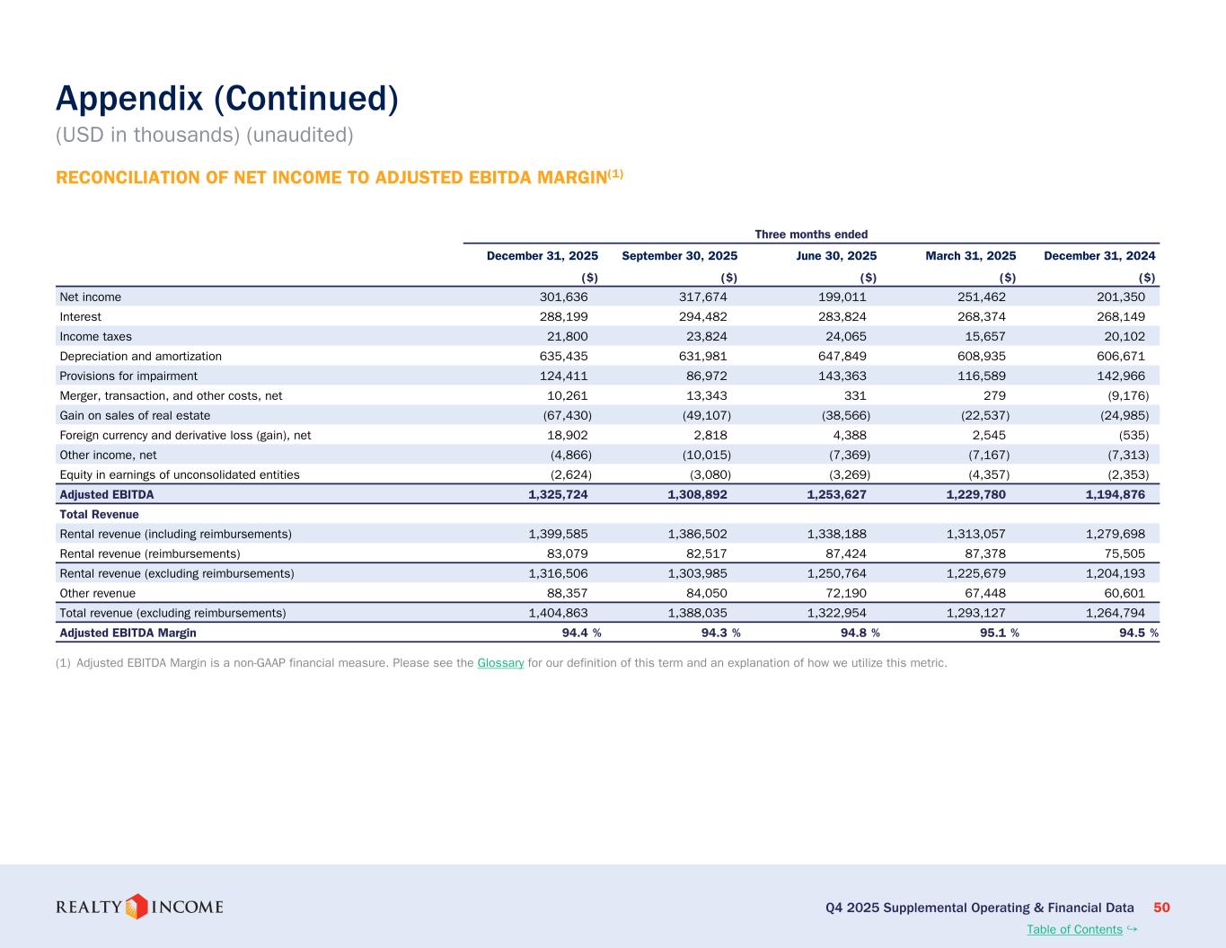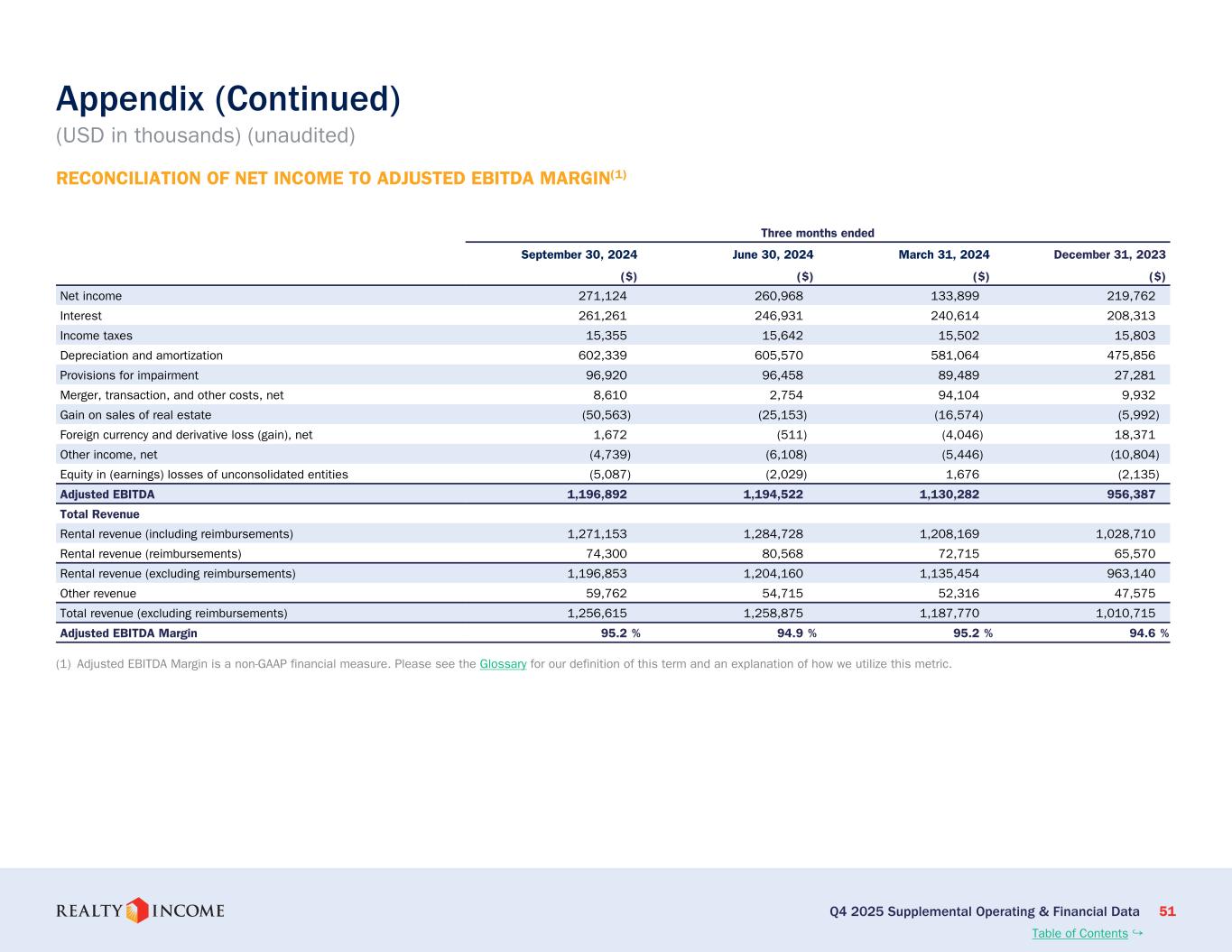 Q4 2025 Supplemental Operating & Financial Data 50 Appendix (Continued) (USD in thousands) (unaudited) Table of Contents ↪ Three months ended December 31, 2025 September 30, 2025 June 30, 2025 March 31, 2025 December 31, 2024 ($) ($) ($) ($) ($) Net income 301,636 317,674 199,011 251,462 201,350 Interest 288,199 294,482 283,824 268,374 268,149 Income taxes 21,800 23,824 24,065 15,657 20,102 Depreciation and amortization 635,435 631,981 647,849 608,935 606,671 Provisions for impairment 124,411 86,972 143,363 116,589 142,966 Merger, transaction, and other costs, net 10,261 13,343 331 279 (9,176) Gain on sales of real estate (67,430) (49,107) (38,566) (22,537) (24,985) Foreign currency and derivative loss (gain), net 18,902 2,818 4,388 2,545 (535) Other income, net (4,866) (10,015) (7,369) (7,167) (7,313) Equity in earnings of unconsolidated entities (2,624) (3,080) (3,269) (4,357) (2,353) Adjusted EBITDA 1,325,724 1,308,892 1,253,627 1,229,780 1,194,876 Total Revenue Rental revenue (including reimbursements) 1,399,585 1,386,502 1,338,188 1,313,057 1,279,698 Rental revenue (reimbursements) 83,079 82,517 87,424 87,378 75,505 Rental revenue (excluding reimbursements) 1,316,506 1,303,985 1,250,764 1,225,679 1,204,193 Other revenue 88,357 84,050 72,190 67,448 60,601 Total revenue (excluding reimbursements) 1,404,863 1,388,035 1,322,954 1,293,127 1,264,794 Adjusted EBITDA Margin 94.4 % 94.3 % 94.8 % 95.1 % 94.5 % RECONCILIATION OF NET INCOME TO ADJUSTED EBITDA MARGIN(1) (1) Adjusted EBITDA Margin is a non-GAAP financial measure. Please see the Glossary for our definition of this term and an explanation of how we utilize this metric.