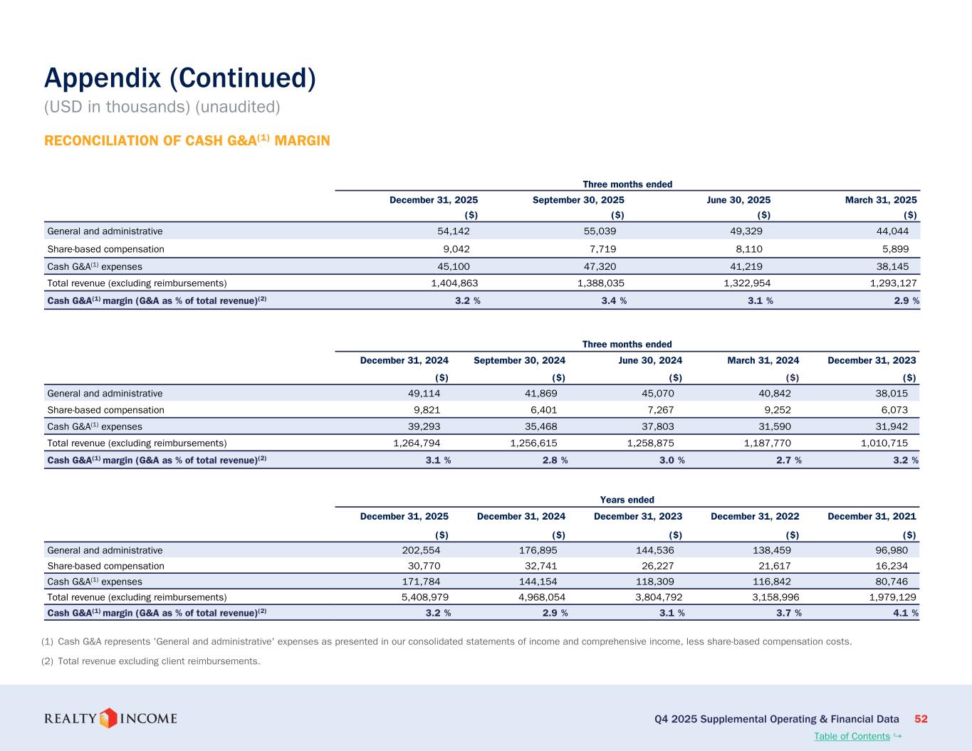 Q4 2025 Supplemental Operating & Financial Data 52 Appendix (Continued) (USD in thousands) (unaudited) Table of Contents ↪ Years ended December 31, 2025 December 31, 2024 December 31, 2023 December 31, 2022 December 31, 2021 ($) ($) ($) ($) ($) General and administrative 202,554 176,895 144,536 138,459 96,980 Share-based compensation 30,770 32,741 26,227 21,617 16,234 Cash G&A(1) expenses 171,784 144,154 118,309 116,842 80,746 Total revenue (excluding reimbursements) 5,408,979 4,968,054 3,804,792 3,158,996 1,979,129 Cash G&A(1) margin (G&A as % of total revenue)(2) 3.2 % 2.9 % 3.1 % 3.7 % 4.1 % RECONCILIATION OF CASH G&A(1) MARGIN (1) Cash G&A represents 'General and administrative' expenses as presented in our consolidated statements of income and comprehensive income, less share-based compensation costs. (2) Total revenue excluding client reimbursements. Three months ended December 31, 2025 September 30, 2025 June 30, 2025 March 31, 2025 ($) ($) ($) ($) General and administrative 54,142 55,039 49,329 44,044 Share-based compensation 9,042 7,719 8,110 5,899 Cash G&A(1) expenses 45,100 47,320 41,219 38,145 Total revenue (excluding reimbursements) 1,404,863 1,388,035 1,322,954 1,293,127 Cash G&A(1) margin (G&A as % of total revenue)(2) 3.2 % 3.4 % 3.1 % 2.9 % Three months ended December 31, 2024 September 30, 2024 June 30, 2024 March 31, 2024 December 31, 2023 ($) ($) ($) ($) ($) General and administrative 49,114 41,869 45,070 40,842 38,015 Share-based compensation 9,821 6,401 7,267 9,252 6,073 Cash G&A(1) expenses 39,293 35,468 37,803 31,590 31,942 Total revenue (excluding reimbursements) 1,264,794 1,256,615 1,258,875 1,187,770 1,010,715 Cash G&A(1) margin (G&A as % of total revenue)(2) 3.1 % 2.8 % 3.0 % 2.7 % 3.2 %