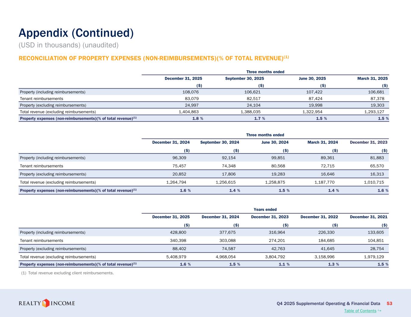 Q4 2025 Supplemental Operating & Financial Data 53 Appendix (Continued) (USD in thousands) (unaudited) Table of Contents ↪ RECONCILIATION OF PROPERTY EXPENSES (NON-REIMBURSEMENTS)(% OF TOTAL REVENUE)(1) (1) Total revenue excluding client reimbursements. Three months ended December 31, 2025 September 30, 2025 June 30, 2025 March 31, 2025 ($) ($) ($) ($) Property (including reimbursements) 108,076 106,621 107,422 106,681 Tenant reimbursements 83,079 82,517 87,424 87,378 Property (excluding reimbursements) 24,997 24,104 19,998 19,303 Total revenue (excluding reimbursements) 1,404,863 1,388,035 1,322,954 1,293,127 Property expenses (non-reimbursements)(% of total revenue)(1) 1.8 % 1.7 % 1.5 % 1.5 % Three months ended December 31, 2024 September 30, 2024 June 30, 2024 March 31, 2024 December 31, 2023 ($) ($) ($) ($) ($) Property (including reimbursements) 96,309 92,154 99,851 89,361 81,883 Tenant reimbursements 75,457 74,348 80,568 72,715 65,570 Property (excluding reimbursements) 20,852 17,806 19,283 16,646 16,313 Total revenue (excluding reimbursements) 1,264,794 1,256,615 1,258,875 1,187,770 1,010,715 Property expenses (non-reimbursements)(% of total revenue)(1) 1.6 % 1.4 % 1.5 % 1.4 % 1.6 % Years ended December 31, 2025 December 31, 2024 December 31, 2023 December 31, 2022 December 31, 2021 ($) ($) ($) ($) ($) Property (including reimbursements) 428,800 377,675 316,964 226,330 133,605 Tenant reimbursements 340,398 303,088 274,201 184,685 104,851 Property (excluding reimbursements) 88,402 74,587 42,763 41,645 28,754 Total revenue (excluding reimbursements) 5,408,979 4,968,054 3,804,792 3,158,996 1,979,129 Property expenses (non-reimbursements)(% of total revenue)(1) 1.6 % 1.5 % 1.1 % 1.3 % 1.5 %