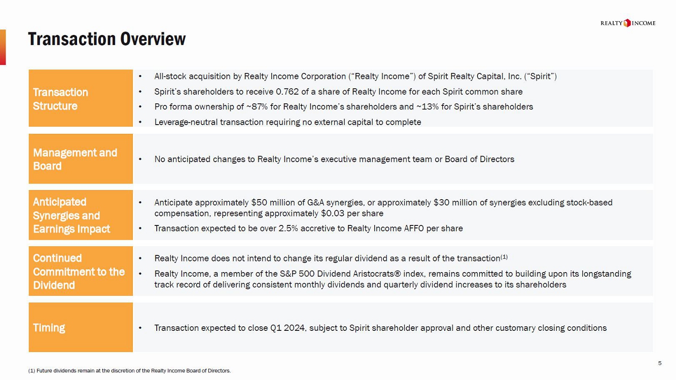 3 Participants in the Solicitation Realty Income, Spirit and certain of their respective directors and executive officers may be deemed to be participants in the solicitation of proxies in respect of the proposed transaction. Information about the directors and executive officers of Realty Income, including a description of their direct or indirect interests, by security holdings or otherwise, is set forth in Realty Income’s proxy statement for its 2023 Annual Meeting of Stockholders, which was filed with the SEC on March 31, 2023, and Realty Income’s Annual Report on Form 10-K for the fiscal year ended December 31, 2022, which was filed with the SEC on February 22, 2023. Information about the directors and executive officers of Spirit, including a description of their direct or indirect interests, by security holdings or otherwise, is set forth in Spirit’s proxy statement for its 2023 Annual Meeting of Stockholders, which was filed with the SEC on March 23, 2023, and Spirit’s Annual Report on Form 10-K for the fiscal year ended December 31, 2022, which was filed with the SEC on February 28, 2023. Other information regarding the participants in the proxy solicitations and a description of their direct and indirect interests, by security holdings or otherwise, will be contained in the proxy statement/prospectus and other relevant materials to be filed with the SEC regarding the proposed transaction when such materials become available. Investors should read the proxy statement/prospectus carefully when it becomes available before making any voting or investment decisions. You may obtain free copies of these documents from Spirit or Realty Income using the sources indicated above. Non-GAAP Financial Measures This presentation includes non-GAAP financial measures, including the combined company's estimated net debt + preferred / Annualized Adjusted EBITDAre, Adjusted EBITDA, Adjusted EBITDA Margin and Adjusted Funds from Operations, and Realty Income's net debt + preferred / Annualized Adjusted EBITDAre, Adjusted EBITDA, EBITDA, Adjusted EBITDA Margin and Adjusted Funds From Operations. For information on Realty Income's presentation of such non-GAAP financial measures, see the Earnings Release and Supplemental Report available Realty Income's investor relations website at www.realtyincome.com. A quantitative reconciliation for the combined company's estimated net debt + preferred / Annualized Adjusted EBITDAre, Adjusted EBITDA, Adjusted EBITDA Margin and Adjusted Funds from to estimated consolidated net income after giving effect to the transaction is not available without unreasonable efforts due to the inherent variability in timing and/or amount of various items considered in Realty Income's underwriting of the transaction that could impact estimated consolidated net income. Such pro forma information was not derived from unaudited pro forma consolidated financial statements prepared in accordance with Article 11 of Regulation S-X. No assurance can be given that such pro forma information will not change in connection with the preparation of such unaudited pro forma consolidated financial statements. No Offer or Solicitation This communication and the information contained herein is not intended to and shall not constitute an offer to buy or sell or the solicitation of an offer to buy or sell any securities, or a solicitation of any vote or approval, nor shall there be any sale of securities in any jurisdiction in which such offer, solicitation or sale would be unlawful prior to registration or qualification under the securities laws of any such jurisdiction. No offering of securities shall be made, except by means of a prospectus meeting the requirements of Section 10 of the U.S. Securities Act of 1933, as amended. Disclaimer, Continued