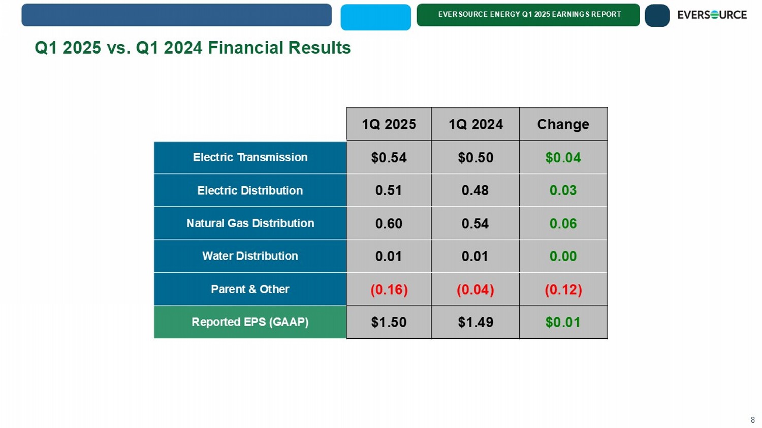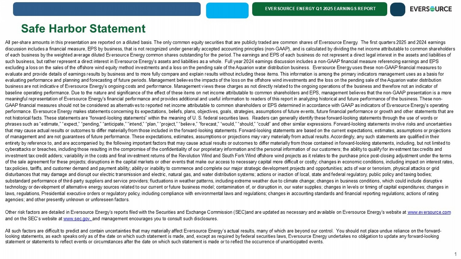 EVERSOURCE ENERGY Q1 2025 EARNINGS REPORT Safe Harbor Statement 1 All per - share amounts in this presentation are reported on a diluted basis. The only common equity securities that are publicly traded are common shares of Eversource Energy. The first quarters 2025 and 2024 earnings discussion includes a financial measure, EPS by business, that is not recognized under generally accepted accounting principl es (non - GAAP), and is calculated by dividing the net income attributable to common shareholders of each business by the weighted average diluted Eversource Energy common shares outstanding for the period. The earnings and EP S of each business do not represent a direct legal interest in the assets and liabilities of such business, but rather represent a direct interest in Eversource Energy’s assets and liabilities as a whole. Full year 20 24 earnings discussion includes a non - GAAP financial measure referencing earnings and EPS excluding a loss on the sales of the offshore wind equity method investments and a loss on the pending sale of the Aquarion w ate r distribution business. Eversource Energy uses these non - GAAP financial measures to evaluate and provide details of earnings results by business and to more fully compare and explain results without including the se items. This information is among the primary indicators management uses as a basis for evaluating performance and planning and forecasting of future periods. Management believes the impacts of the loss on the off sho re wind investments and the loss on the pending sale of the Aquarion water distribution business are not indicative of Eversource Energy's ongoing costs and performance. Management views these charges as not direc tly related to the ongoing operations of the business and therefore not an indicator of baseline operating performance. Due to the nature and significance of the effect of these items on net income attributable to co mmon shareholders and EPS, management believes that the non - GAAP presentation is a more meaningful representation of Eversource Energy's financial performance and provides additional and useful information to read ers of this report in analyzing historical and future performance of the business. These non - GAAP financial measures should not be considered as alternatives to reported net income attributable to common shareholders o r E PS determined in accordance with GAAP as indicators of Eversource Energy's operating performance. Eversource Energy makes statements concerning its expectations, beliefs, plans, objectives, goals, strategies, a ssu mptions of future events, future financial performance or growth and other statements that are not historical facts. These statements are “forward - looking statements” within the meaning of U. S. federal securities laws. Re aders can generally identify these forward - looking statements through the use of words or phrases such as “estimate,” “expect,” “pending,” “anticipate,” “intend,” “plan,” “project,” “believe,” “forecast,” “would,” “ sho uld,” “could” and other similar expressions. Forward - looking statements involve risks and uncertainties that may cause actual results or outcomes to differ materially from those included in the forward - looking statements. Forward - lo oking statements are based on the current expectations, estimates, assumptions or projections of management and are not guarantees of future performance. These expectations, estimates, assumptions or projections may var y m aterially from actual results. Accordingly, any such statements are qualified in their entirety by reference to, and are accompanied by, the following important factors that may cause actual results or outcomes t o d iffer materially from those contained in forward - looking statements, including, but not limited to cyberattacks or breaches, including those resulting in the compromise of the confidentiality of our proprietary information a nd the personal information of our customers; the ability to qualify for investment tax credits and investment tax credit adders; variability in the costs and final investment returns of the Revolution Wind and South Fork Win d o ffshore wind projects as it relates to the purchase price post - closing adjustment under the terms of the sale agreement for these projects; disruptions in the capital markets or other events that make our access to necessar y c apital more difficult or costly; changes in economic conditions, including impact on interest rates, tax policies, tariffs, and customer demand and payment ability; ability or inability to commence and complete our major strat egi c development projects and opportunities; acts of war or terrorism, physical attacks or grid disturbances that may damage and disrupt our electric transmission and electric, natural gas, and water distribution systems; ac tions or inaction of local, state and federal regulatory, public policy and taxing bodies; substandard performance of third - party suppliers and service providers; fluctuations in weather patterns, including extreme weat her due to climate change; changes in business conditions, which could include disruptive technology or development of alternative energy sources related to our current or future business model; contamination of, or di sruption in, our water supplies; changes in levels or timing of capital expenditures; changes in laws, regulations, Presidential executive orders or regulatory policy, including compliance with environmental laws and regul ati ons; changes in accounting standards and financial reporting regulations; actions of rating agencies; and other presently unknown or unforeseen factors. Other risk factors are detailed in Eversource Energy’s reports filed with the Securities and Exchange Commission (SEC)and are up dated as necessary and available on Eversource Energy’s website at www.eversource.com and on the SEC’s website at www.sec.