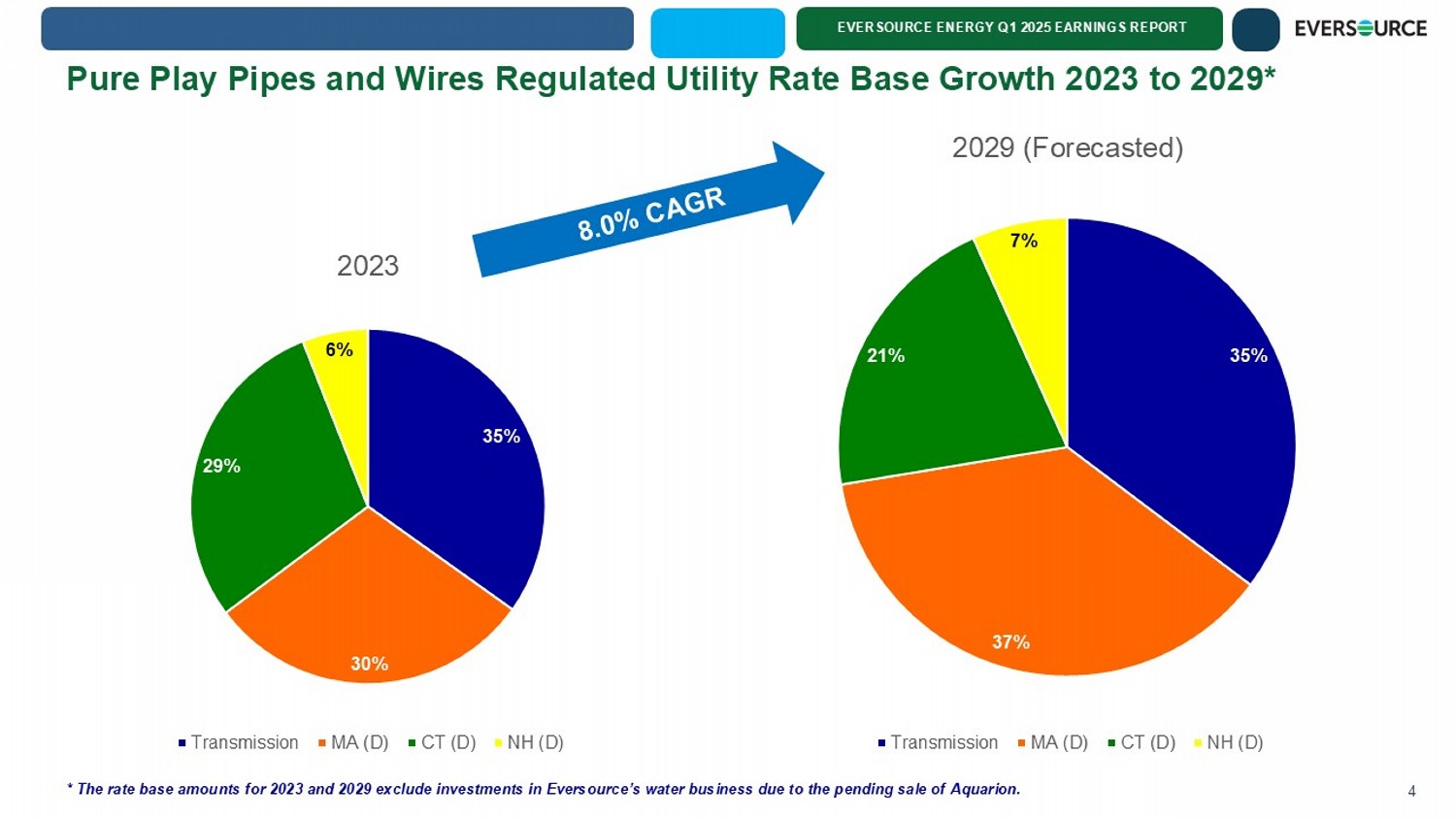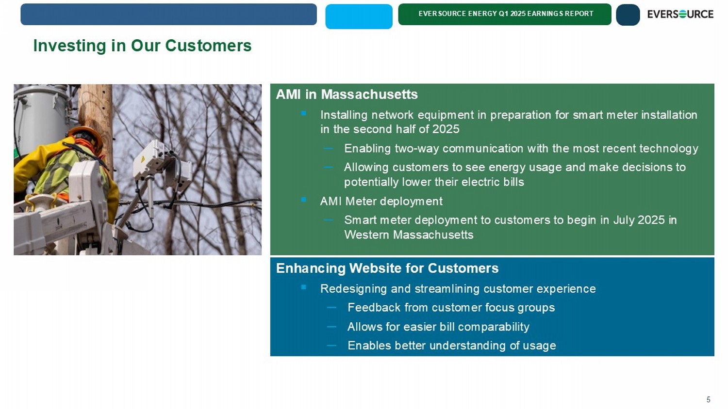 EVERSOURCE ENERGY Q1 2025 EARNINGS REPORT Pure Play Pipes and Wires Regulated Utility Rate Base Growth 2023 to 2029* 4 35% 30% 29% 6% 2023 Transmission MA (D) CT (D) NH (D) 35% 37% 21% 7% 2029 (Forecasted) Transmission MA (D) CT (D) NH (D) * The rate base amounts for 2023 and 2029 exclude investments in Eversource’s water business due to the pending sale of Aquarion .