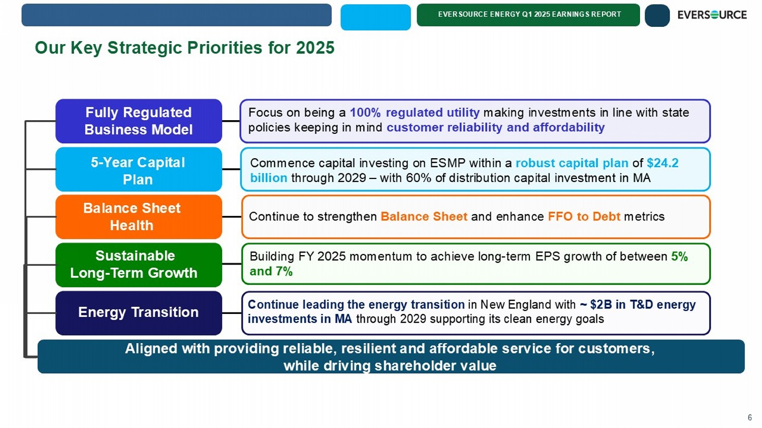EVERSOURCE ENERGY Q1 2025 EARNINGS REPORT 5 Investing in Our Customers AMI in Massachusetts ▪ Installing network equipment in preparation for smart meter installation in the second half of 2025 – Enabling two - way communication with the most recent technology – Allowing customers to see energy usage and make decisions to potentially lower their electric bills ▪ AMI Meter deployment – Smart meter deployment to customers to begin in July 2025 in Western Massachusetts Enhancing Website for Customers ▪ Redesigning and streamlining customer experience – Feedback from customer focus groups – Allows for easier bill comparability – Enables better understanding of usage