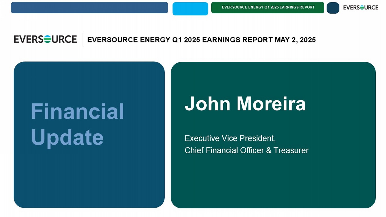 EVERSOURCE ENERGY Q1 2025 EARNINGS REPORT EVERSOURCE ENERGY Q1 2025 EARNINGS REPORT MAY 2, 2025 Executive Vice President, Chief Financial Officer & Treasurer John Moreira Financial Update