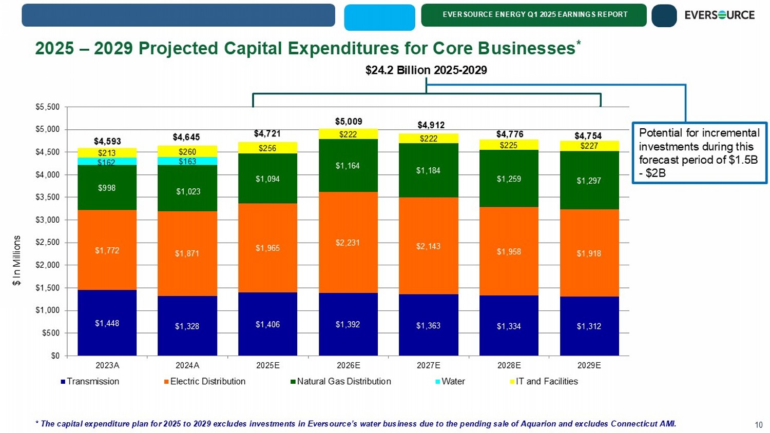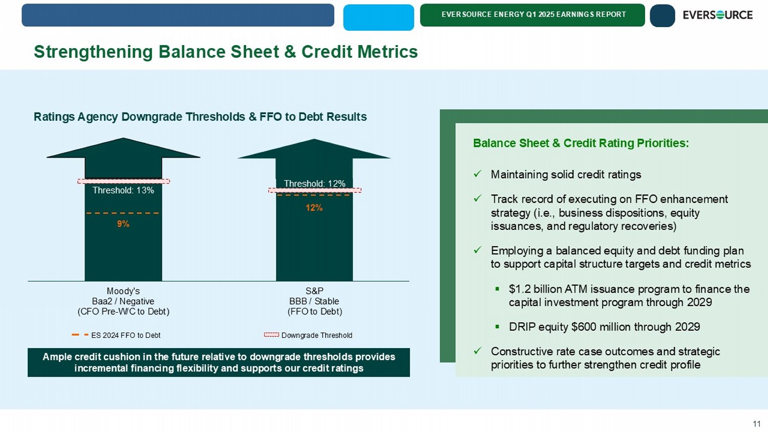 EVERSOURCE ENERGY Q1 2025 EARNINGS REPORT $1,448 $1,328 $1,406 $1,392 $1,363 $1,334 $1,312 $1,772 $1,871 $1,965 $2,231 $2,143 $1,958 $1,918 $998 $1,023 $1,094 $1,164 $1,184 $1,259 $1,297 $162 $163 $213 $260 $256 $222 $222 $225 $227 $4,593 $4,645 $4,721 $5,009 $4,912 $4,776 $4,754 $0 $500 $1,000 $1,500 $2,000 $2,500 $3,000 $3,500 $4,000 $4,500 $5,000 $5,500 2023A 2024A 2025E 2026E 2027E 2028E 2029E Transmission Electric Distribution Natural Gas Distribution Water IT and Facilities $ In Millions $24.2 Billion 2025 - 2029 2025 – 2029 Projected Capital Expenditures for Core Businesses * 10 * The capital expenditure plan for 2025 to 2029 excludes investments in Eversource’s water business due to the pending sale o f A quarion and excludes Connecticut AMI. Potential for incremental investments during this forecast period of $1.5B - $2B