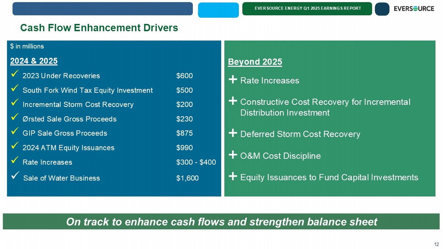 EVERSOURCE ENERGY Q1 2025 EARNINGS REPORT Strengthening Balance Sheet & Credit Metrics Ratings Agency Downgrade Thresholds & FFO to Debt Results Ample credit cushion in the future relative to downgrade thresholds provides incremental financing flexibility and supports our credit ratings Moody's Baa2 / Negative (CFO Pre-W/C to Debt) S&P BBB / Stable (FFO to Debt) 9% 12% ES 2024 FFO to Debt Downgrade Threshold Balance Sheet & Credit Rating Priorities: x Maintaining solid credit ratings x Track record of executing on FFO enhancement strategy (i.e., business dispositions, equity issuances, and regulatory recoveries) x Employing a balanced equity and debt funding plan to support capital structure targets and credit metrics ▪ $1.2 billion ATM issuance program to finance the capital investment program through 2029 ▪ DRIP equity $600 million through 2029 x Constructive rate case outcomes and strategic priorities to further strengthen credit profile Threshold: 13% Threshold: 12% 11
