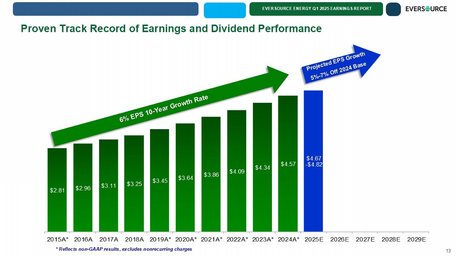 EVERSOURCE ENERGY Q1 2025 EARNINGS REPORT Cash Flow Enhancement Drivers 12 $ in millions 2024 & 2025 x 2023 Under Recoveries $600 x South Fork Wind Tax Equity Investment $500 x Incremental Storm Cost Recovery $200 x Ørsted Sale Gross Proceeds $230 x GIP Sale Gross Proceeds $875 x 2024 ATM Equity Issuances $990 x Rate Increases $300 - $400 Sale of Water Business $1,600 Beyond 2025 Rate Increases Constructive Cost Recovery for Incremental Distribution Investment Deferred Storm Cost Recovery O&M Cost Discipline Equity Issuances to Fund Capital Investments On track to enhance cash flows and strengthen balance sheet