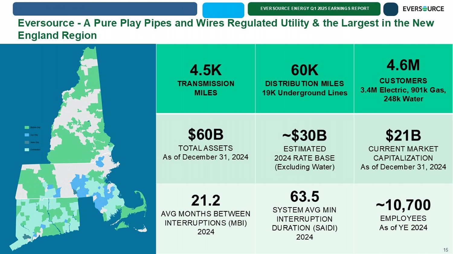 EVERSOURCE ENERGY Q1 2025 EARNINGS REPORT Eversource - A Pure Play Pipes and Wires Regulated Utility & the Largest in the New England Region 15 4.6M CUSTOMERS 3.4M Electric, 901k Gas, 248k Water 60K DISTRIBUTION MILES 19K Underground Lines 4.5K TRANSMISSION MILES $21B CURRENT MARKET CAPITALIZATION As of December 31, 2024 ~$30B ESTIMATED 2024 RATE BASE (Excluding Water) $60B TOTAL ASSETS As of December 31, 2024 ~10,700 EMPLOYEES As of YE 2024 63.5 SYSTEM AVG MIN INTERRUPTION DURATION (SAIDI) 2024 21.2 AVG MONTHS BETWEEN INTERRUPTIONS (MBI) 2024 15