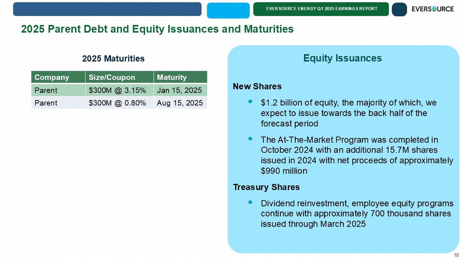 EVERSOURCE ENERGY Q1 2025 EARNINGS REPORT 37% 34% 43% 43% 20% 23% 2023 Rate Base Projected 2029 Rate Base $26.4 billion* $41.9 billion* * Rate base estimates exclude certain CWIP balances which totaled approximately $2.2 billion at the end of 2023 and are expected to increase to approximately $3.3 billion by the end of 2029 Rate Base Growth Driven by Regulated Businesses 17 Transmission Electric Distribution Natural Gas Distribution