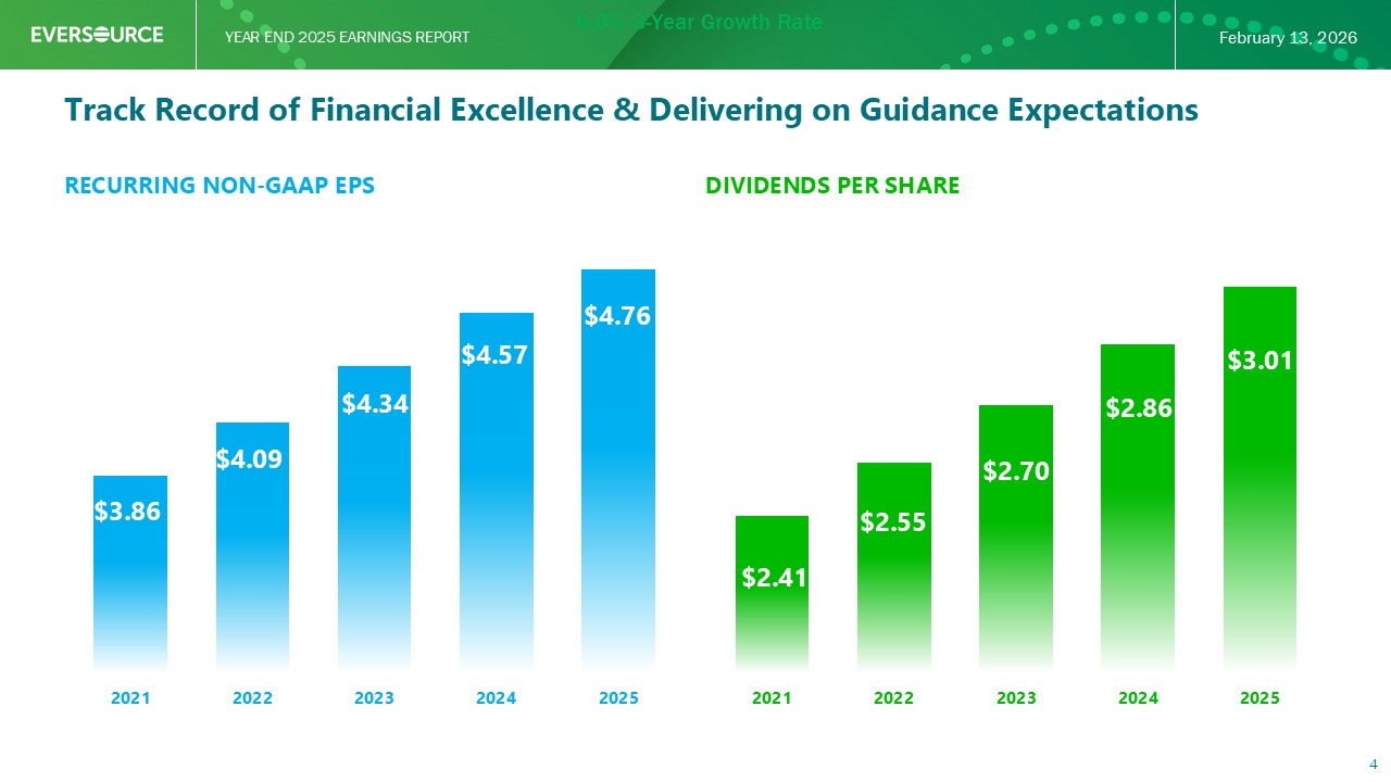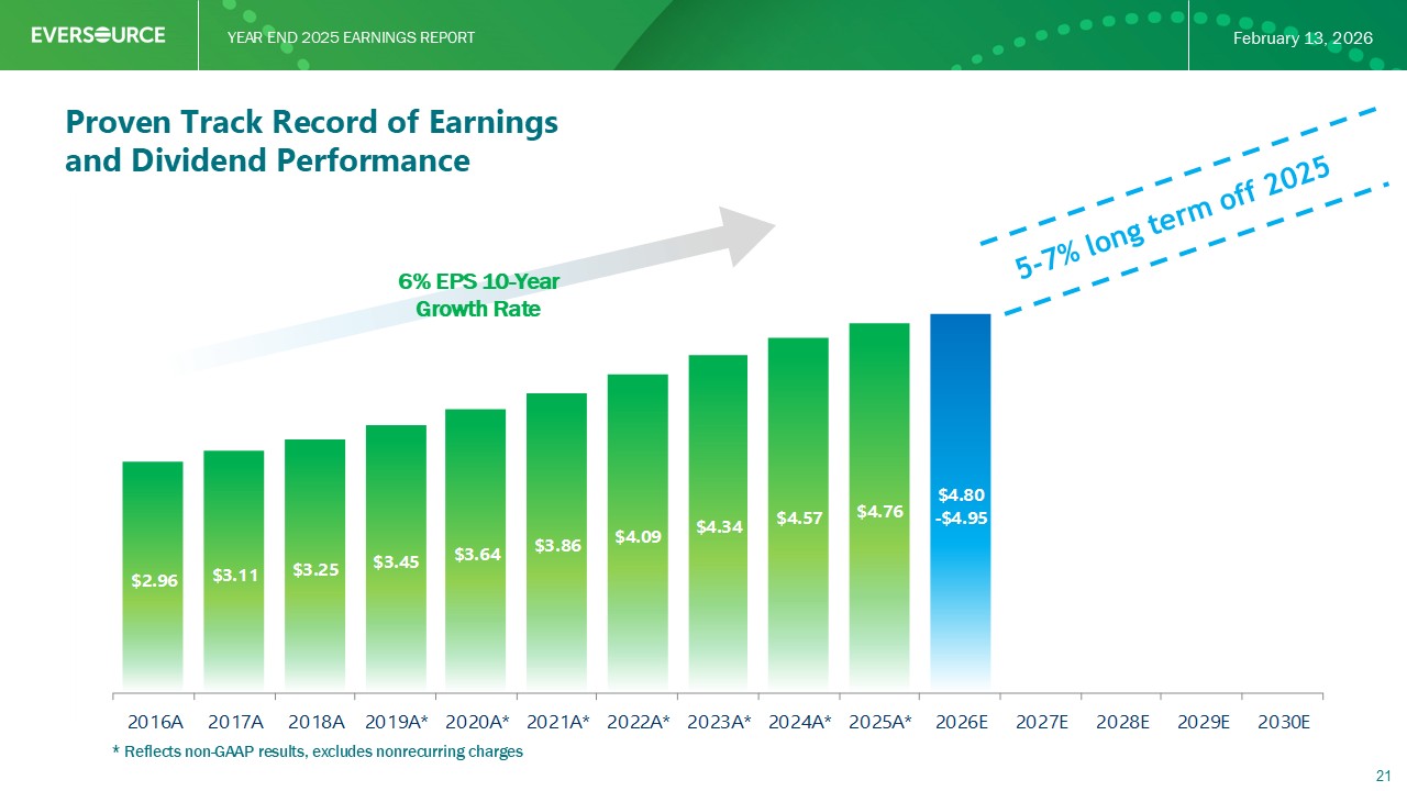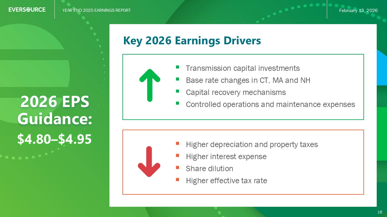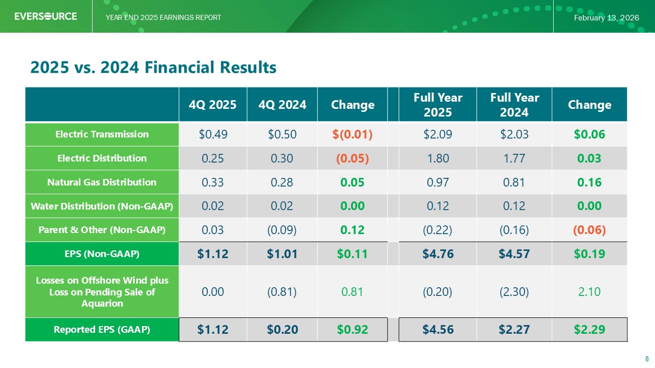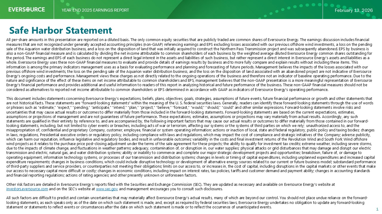 YEAR END 2025 EARNINGS REPORT February 13, 2026 Safe Harbor Statement 1 All per - share amounts in this presentation are reported on a diluted basis. The only common equity securities that are publicly traded are common shares of Eversource Energy. The earnings discussion includes financial measures that are not recognized under generally accepted accounting principles (non - GAAP) referencing earnings and EPS excludin g losses associated with our previous offshore wind investments, a loss on the pending sale of the Aquarion water distribution business, and a loss on the disposition of land that was initially acquired to constr uct the Northern Pass Transmission project and was subsequently abandoned. EPS by business is also a non - GAAP financial measure and is calculated by dividing the net income attributable to common shareholders of each busin ess by the weighted average diluted Eversource Energy common shares outstanding for the period. The earnings and EPS of each business do not represent a direct legal interest in the assets and liabilities of s uch business, but rather represent a direct interest in Eversource Energy’s assets and liabilities as a whole. Eversource Energy uses these non - GAAP financial measures to evaluate and provide details of earnings results by business and to more fully compare and explain results without including these items. This information is among the primary indicators management uses as a basis for evaluating performance and planning and forecastin g o f future periods. Management believes the impacts of the losses associated with our previous offshore wind investments, the loss on the pending sale of the Aquarion water distribution business, and the loss on th e disposition of land associated with an abandoned project are not indicative of Eversource Energy's ongoing costs and performance. Management views these charges as not directly related to the ongoing operations of t he business and therefore not an indicator of baseline operating performance. Due to the nature and significance of the effect of these items on net income attributable to common shareholders and EPS, management be lie ves that the non - GAAP presentation is a more meaningful representation of Eversource Energy's financial performance and provides additional and useful information to readers of this report in analyzing historic al and future performance of the business. These non - GAAP financial measures should not be considered as alternatives to reported net income attributable to common shareholders or EPS determined in accordance with GA AP as indicators of Eversource Energy's operating performance. This document includes statements concerning Eversource Energy’s expectations, beliefs, plans, objectives, goals, strategies, as sumptions of future events, future financial performance or growth and other statements that are not historical facts. These statements are “forward - looking statements” within the meaning of the U. S. federal securities l aws. Generally, readers can identify these forward - looking statements through the use of words or phrases such as “estimate,” “expect,” “pending,” “anticipate,” “intend,” “plan,” “project,” “believe,” “forecast,” “would, ” “ should,” “could” and other similar expressions. Forward - looking statements involve risks and uncertainties that may cause actual results or outcomes to differ materially from those included in the forward - looking statemen ts. Forward - looking statements are based on the current expectations, estimates, assumptions or projections of management and are not guarantees of future performance. These expectations, estimates, assumpt ion s or projections may vary materially from actual results. Accordingly, any such statements are qualified in their entirety by reference to, and are accompanied by, the following important factors that may cau se our actual results or outcomes to differ materially from those contained in our forward - looking statements, including, but not limited to cyber events or breaches, including acts of war or terrorism, affecting our sy stems or the systems of third parties on which we rely; unauthorized access to, and the misappropriation of, confidential and proprietary Company, customer, employee, financial or system operating information; act ion s or inaction of local, state and federal regulatory, public policy and taxing bodies; changes in laws, regulations, Presidential executive orders or regulatory policy, including compliance with laws and regulations, whi ch may impact the cost of compliance and strategic initiatives of the Company; adverse publicity, which can harm our reputation, influence legislative and regulatory bodies, and result in unfavorable outcomes; variability i n t he costs and final investment returns of the Revolution Wind and South Fork Wind offshore wind projects as it relates to the purchase price post - closing adjustment under the terms of the sale agreement for these projec ts; the ability to qualify for investment tax credits; extreme weather, including severe storms, due to the impacts of climate change, and fluctuations in weather patterns; adequacy, contamination of, or disruption in, our wa ter supplies; physical attacks or grid disturbances that may damage and disrupt our electric transmission and electric, natural gas, and water distribution systems; ability or inability to commence and complete our maj or strategic development projects and opportunities; breakdown, failure of, or damage to operating equipment, information technology systems, or processes of our transmission and distribution systems; changes in le vel s or timing of capital expenditures, including unplanned expenditures and increased capital expenditure requirements; changes in business conditions, which could include disruptive technology or development of alterna tiv e energy sources related to our current or future business