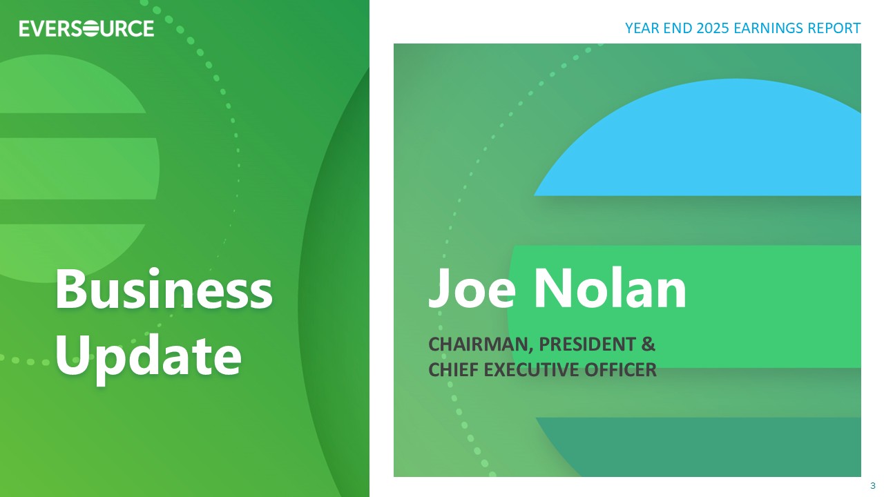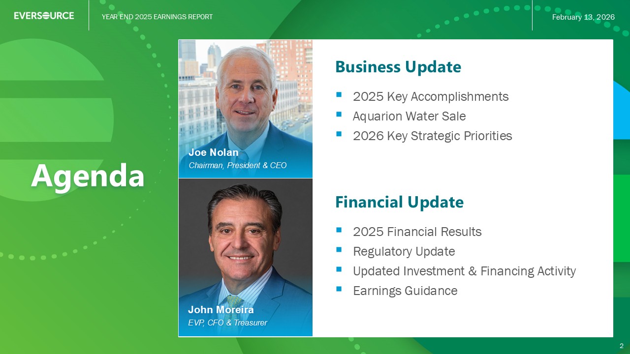 YEAR END 2025 EARNINGS REPORT February 13, 2026 Agenda Business Update ▪ 2025 Key Accomplishments ▪ Aquarion Water Sale ▪ 2026 Key Strategic Priorities 2 Joe Nolan Chairman, President & CEO Financial Update ▪ 2025 Financial Results ▪ Regulatory Update ▪ Updated Investment & Financing Activity ▪ Earnings Guidance John Moreira EVP, CFO & Treasurer
