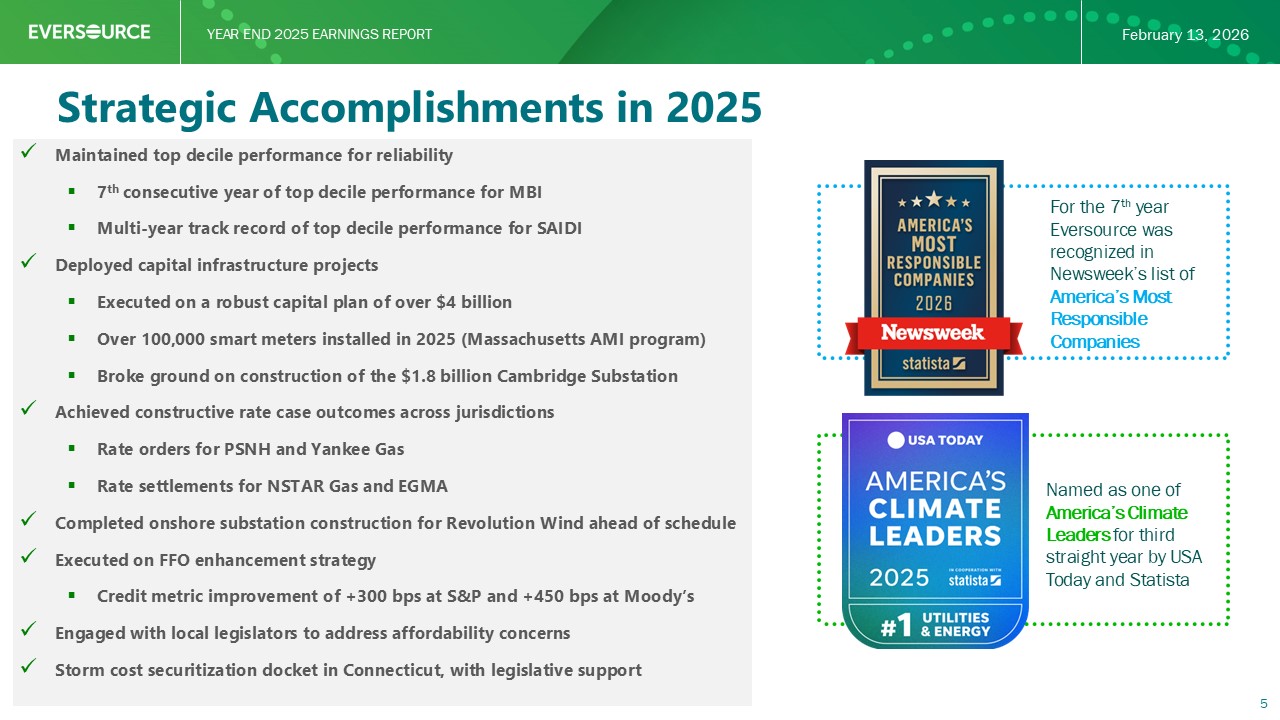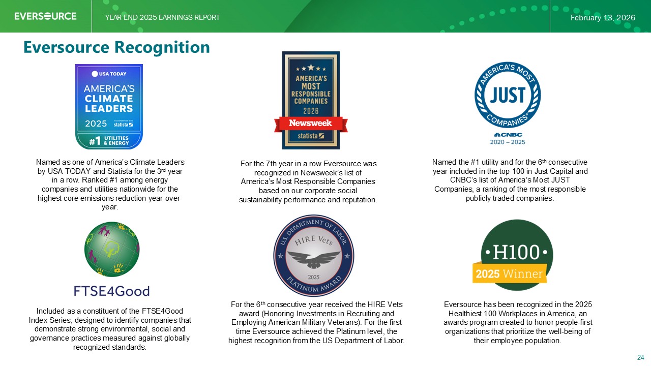 YEAR END 2025 EARNINGS REPORT February 13, 2026 For the 6 th consecutive year received the HIRE Vets award (Honoring Investments in Recruiting and Employing American Military Veterans). For the first time Eversource achieved the Platinum level, the highest recognition from the US Department of Labor. Named as one of America’s Climate Leaders by USA TODAY and Statista for the 3 rd year in a row. Ranked #1 among energy companies and utilities nationwide for the highest core emissions reduction year - over - year. For the 7th year in a row Eversource was recognized in Newsweek’s list of America’s Most Responsible Companies based on our corporate social sustainability performance and reputation. Named the #1 utility and for the 6 th consecutive year included in the top 100 in Just Capital and CNBC’s list of America’s Most JUST Companies, a ranking of the most responsible publicly traded companies. Included as a constituent of the FTSE4Good Index Series, designed to identify companies that demonstrate strong environmental, social and governance practices measured against globally recognized standards. Eversource has been recognized in the 2025 Healthiest 100 Workplaces in America, an awards program created to honor people - first organizations that prioritize the well - being of their employee population. 24 Eversource Recognition