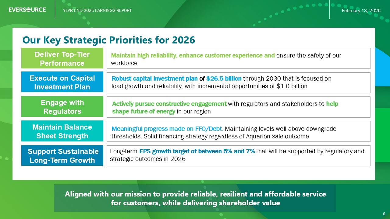 YEAR END 2025 EARNINGS REPORT February 13, 2026 5 Strategic Accomplishments in 2025 x Maintained top decile performance for reliability ▪ 7 th consecutive year of top decile performance for MBI ▪ Multi - year track record of top decile performance for SAIDI x Deployed capital infrastructure projects ▪ Executed on a robust capital plan of ~$5 billion ▪ Over 100,000 smart meters installed in 2025 (Massachusetts AMI program) ▪ Broke ground on construction of the $1.8 billion Cambridge Substation x Achieved constructive rate case outcomes across jurisdictions ▪ Rate orders for PSNH and Yankee Gas ▪ Rate settlements for NSTAR Gas and EGMA x Completed onshore substation construction for Revolution Wind ahead of schedule x Executed on FFO enhancement strategy ▪ Credit metric improvement of +300 bps at S&P and +450 bps at Moody’s x Engaged with local legislators to address affordability concerns x Storm cost securitization docket in Connecticut, with legislative support For the 7 th year Eversource was recognized in Newsweek’s list of America’s Most Responsible Companies Named as one of America’s Climate Leaders for third straight year by USA Today and Statista