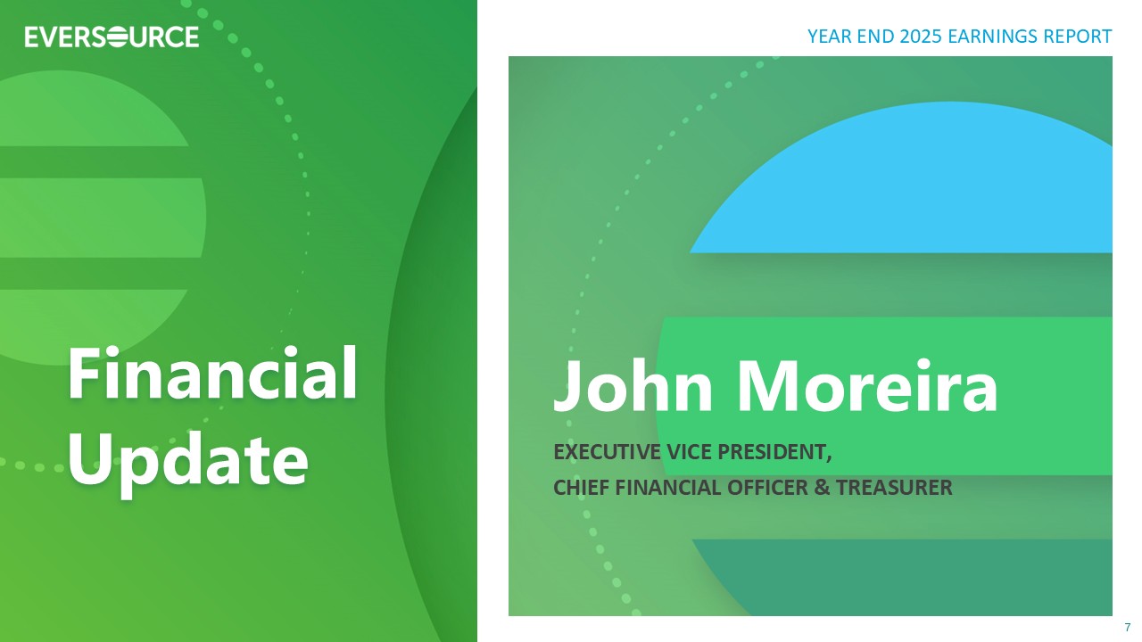 YEAR END 2025 EARNINGS REPORT February 13, 2026 Aligned with our mission to provide reliable, resilient and affordable service for customers, while delivering shareholder value Our Key Strategic Priorities for 2026 Long - term EPS growth target of between 5% and 7% that will be supported by regulatory and strategic outcomes in 2026 Execute on Capital Investment Plan Maintain Balance Sheet Strength Deliver Top - Tier Performance Robust capital investment plan of $26.5 billion through 2030 that is focused on load growth and reliability, with incremental opportunities of $1.0 billion Meaningful progress made on FFO/Debt. Maintaining levels well above downgrade thresholds. Solid financing strategy regardless of Aquarion sale outcome Maintain high reliability, enhance customer experience and ensure the safety of our workforce Engage with Regulators Actively pursue constructive engagement with regulators and stakeholders to help shape future of energy in our region Support Sustainable Long - Term Growth 6