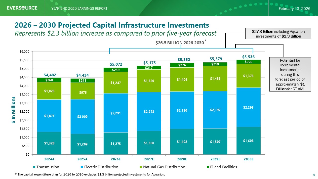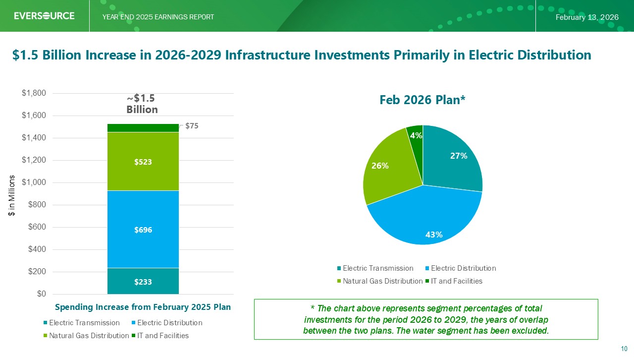 YEAR END 2025 EARNINGS REPORT February 13, 2026 $1,328 $1,209 $1,275 $1,360 $1,492 $1,507 $1,608 $1,871 $2,009 $2,291 $2,278 $2,180 $2,197 $2,296 $1,023 $975 $1,247 $1,320 $1,404 $1,456 $1,376 $260 $241 $259 $217 $276 $219 $256 $4,482 $4,434 $5,072 $5,175 $5,352 $5,379 $5,536 $0 $500 $1,000 $1,500 $2,000 $2,500 $3,000 $3,500 $4,000 $4,500 $5,000 $5,500 $6,000 2024A 2025A 2026E 2027E 2028E 2029E 2030E Transmission Electric Distribution Natural Gas Distribution IT and Facilities $ In Millions $26.5 BILLION 2026 - 2030 * 2026 – 2030 Projected Capital Infrastructure Investments 9 * The capital expenditure plan for 2026 to 2030 excludes $1.3 billion projected investments for Aquarion. Represents $2.3 billion increase as compared to prior five - year forecast $27.8 Billion including Aquarion investments of $1.3 Billion Potential for incremental investments during this forecast period of approximately $1 Billion for CT AMI
