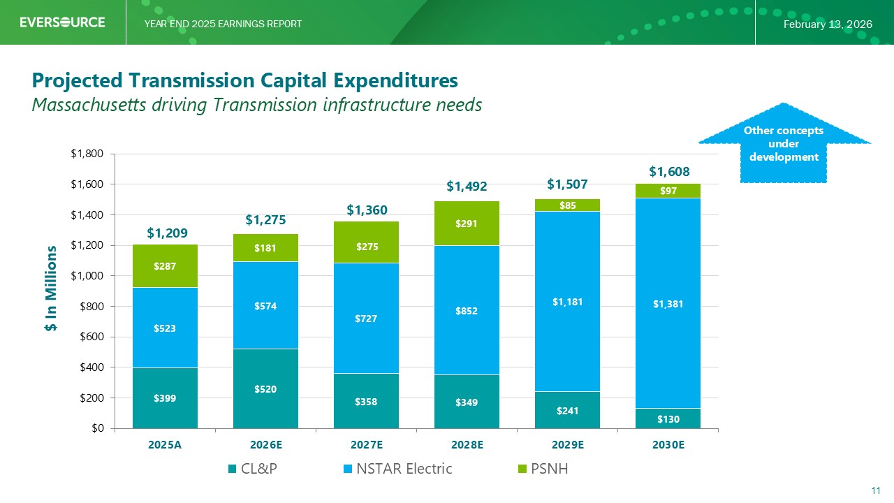 YEAR END 2025 EARNINGS REPORT February 13, 2026 $399 $520 $358 $349 $241 $130 $523 $574 $727 $852 $1,181 $1,381 $287 $181 $275 $291 $85 $97 $1,209 $1,275 $1,360 $1,492 $1,507 $1,608 $0 $200 $400 $600 $800 $1,000 $1,200 $1,400 $1,600 $1,800 2025A 2026E 2027E 2028E 2029E 2030E CL&P NSTAR Electric PSNH Other concepts under development Projected Transmission Capital Expenditures 11 $ In Millions Massachusetts driving Transmission infrastructure need s