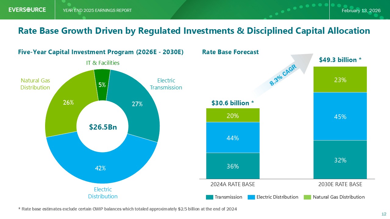 YEAR END 2025 EARNINGS REPORT February 13, 2026 36% 32% 44% 45% 20% 23% 2024A RATE BASE Rate Base Forecast $30.6 billion * $49.3 billion * Rate Base Growth Driven by Regulated Investments & Disciplined Capital Allocation * Rate base estimates exclude certain CWIP balances which totaled approximately $2.5 billion at the end of 2024 2030E RATE BASE Natural Gas Distribution Electric Distribution Transmission Five - Year Capital Investment Program (2026E - 2030E) 27% 42% 26% 5% Electric Transmission Electric Distribution Natural Gas Distribution IT & Facilities $26.5Bn 12