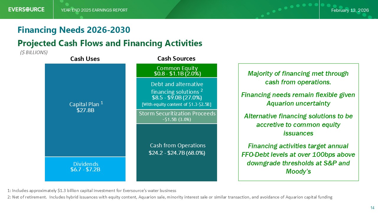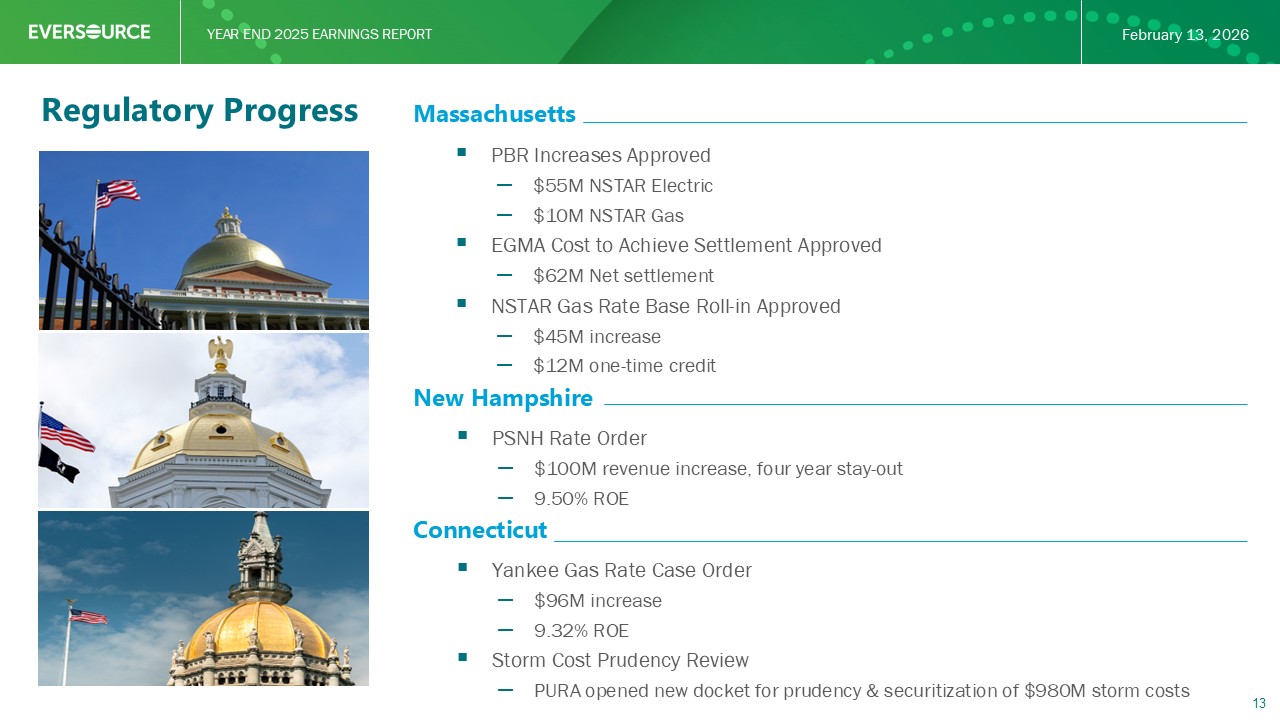 YEAR END 2025 EARNINGS REPORT February 13, 2026 Regulatory Progress Massachusetts ▪ PBR Increases Approved – $55M NSTAR Electric – $10M NSTAR Gas ▪ EGMA Cost to Achieve Settlement Approved – $62M Net settlement ▪ NSTAR Gas Rate Base Roll - in Approved – $45M increase – $12M one - time credit New Hampshire ▪ PSNH Rate Order – $100M revenue increase, four year stay - out – 9.50% ROE Connecticut ▪ Yankee Gas Rate Case Order – $96M increase – 9.32% ROE ▪ Storm Cost Prudency Review – PURA opened new docket for prudency & securitization of $980M storm costs 13