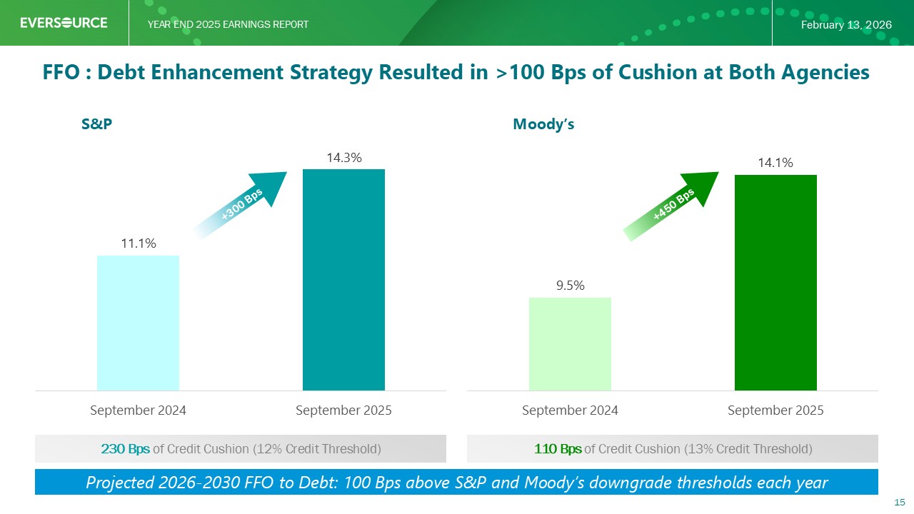 YEAR END 2025 EARNINGS REPORT February 13, 2026 $6.7 - $7.2B $27.8B $24.2 - $24.7B (68.0%) $8.5 - $9.0B (27.0%) $0.8 - $1.1B (2.0%) Projected Cash Flows and Financing Activities 14 Financing Needs 2026 - 2030 Cash Uses Cash Sources Common Equity Debt and alternative financing solutions 2 Cash from Operations Dividends Capital Plan 1 ($ BILLIONS) 1: Includes approximately $1.3 billion capital investment for Eversource’s water business 2: Net of retirement. Includes hybrid issuances with equity content, Aquarion sale, minority interest sale or similar transaction, and avoidance of Aquarion capital funding Majority of financing met through cash from operations. Financing needs remain flexible given Aquarion uncertainty Alternative financing solutions to be accretive to common equity issuances Financing activities target annual FFO - Debt levels at over 100bps above downgrade thresholds at S&P and Moody’s Storm Securitization Proceeds [With equity content of $1.3 - $2.5B] ~$1.5B (3.0%)