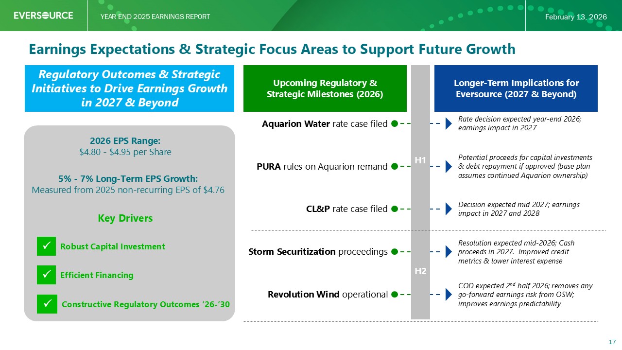 YEAR END 2025 EARNINGS REPORT February 13, 2026 Key 2026 Earnings Drivers 2026 EPS Guidance: ▪ Transmission capital investments ▪ Base rate changes in CT, MA and NH ▪ Capital recovery mechanisms ▪ Controlled operations and maintenance expenses 16 ▪ Higher depreciation and property taxes ▪ Higher interest expense ▪ Share dilution ▪ Higher effective tax rate $4.80 – $4.95