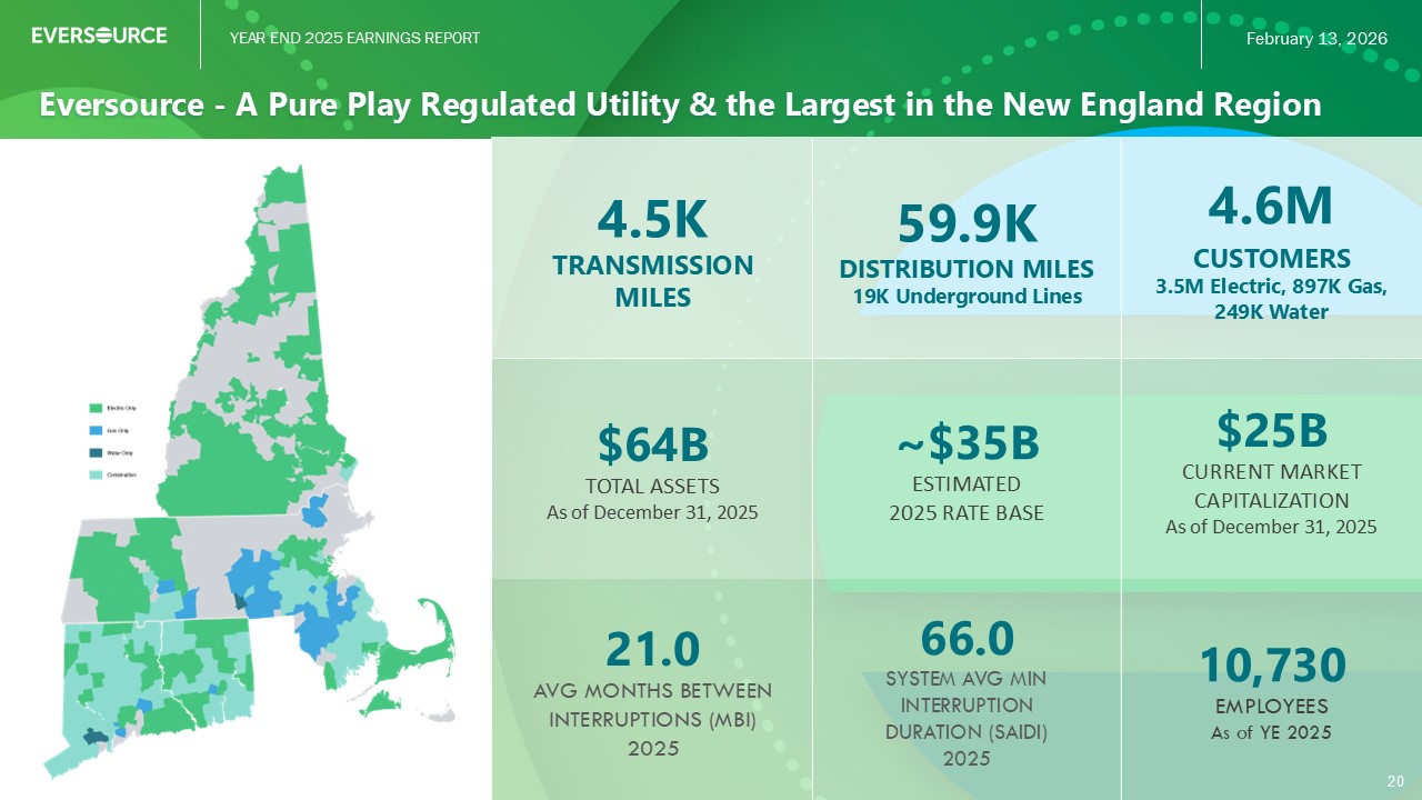 YEAR END 2025 EARNINGS REPORT February 13, 2026 Eversource - A Pure Play Regulated Utility & the Largest in the New England Region 20 4.6M CUSTOMERS 3.5M Electric, 897K Gas, 249K Water 59.9K DISTRIBUTION MILES 19K Underground Lines 4.5K TRANSMISSION MILES $25B CURRENT MARKET CAPITALIZATION As of December 31, 2025 $30.6B ACTUAL 2024 RATE BASE $64B TOTAL ASSETS As of December 31, 2025 10,730 EMPLOYEES As of YE 2025 66.0 SYSTEM AVG MIN INTERRUPTION DURATION (SAIDI) 2025 21.0 AVG MONTHS BETWEEN INTERRUPTIONS (MBI) 2025