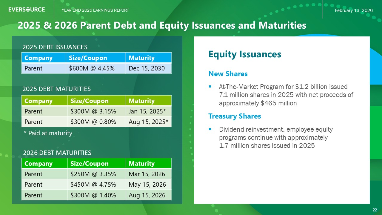YEAR END 2025 EARNINGS REPORT February 13, 2026 $2.96 $3.11 $3.25 $3.45 $3.64 $3.86 $4.09 $4.34 $4.57 $4.76 $4.80 - $4.95 2016A 2017A 2018A 2019A* 2020A* 2021A* 2022A* 2023A* 2024A* 2025A* 2026E 2027E 2028E 2029E 2030E * Reflects non - GAAP results, excludes nonrecurring charges 21 Proven Track Record of Earnings and Dividend Performance 6% EPS 10 - Year Growth Rate