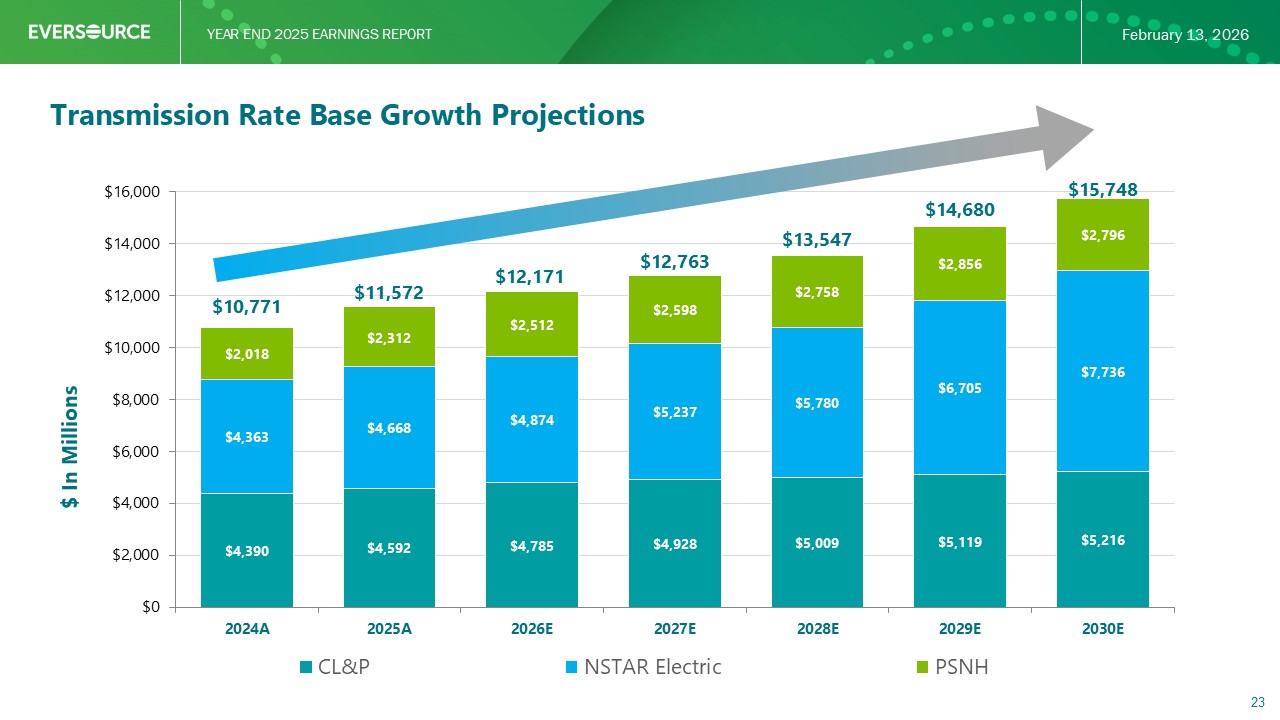 YEAR END 2025 EARNINGS REPORT February 13, 2026 $4,390 $4,592 $4,785 $4,928 $5,009 $5,119 $5,216 $4,363 $4,668 $4,874 $5,237 $5,780 $6,705 $7,736 $2,018 $2,312 $2,512 $2,598 $2,758 $2,856 $2,796 $10,771 $11,572 $12,171 $12,763 $13,547 $14,680 $15,748 $0 $2,000 $4,000 $6,000 $8,000 $10,000 $12,000 $14,000 $16,000 2024A 2025A 2026E 2027E 2028E 2029E 2030E CL&P NSTAR Electric PSNH Transmission Rate Base Growth Projections 23 $ In Millions