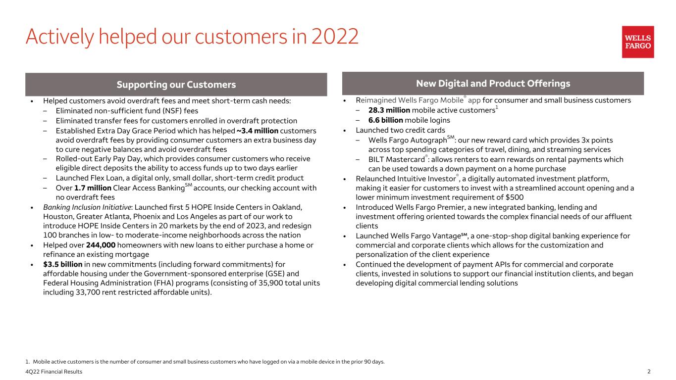 24Q22 Financial Results • Helped customers avoid overdraft fees and meet short-term cash needs: – Eliminated non-sufficient fund (NSF) fees – Eliminated transfer fees for customers enrolled in overdraft protection – Established Extra Day Grace Period which has helped ~3.4 million customers avoid overdraft fees by providing consumer customers an extra business day to cure negative balances and avoid overdraft fees – Rolled-out Early Pay Day, which provides consumer customers who receive eligible direct deposits the ability to access funds up to two days earlier – Launched Flex Loan, a digital only, small dollar, short-term credit product – Over 1.7 million Clear Access BankingSM accounts, our checking account with no overdraft fees • Banking Inclusion Initiative: Launched first 5 HOPE Inside Centers in Oakland, Houston, Greater Atlanta, Phoenix and Los Angeles as part of our work to introduce HOPE Inside Centers in 20 markets by the end of 2023, and redesign 100 branches in low‑ to moderate‑income neighborhoods across the nation • Helped over 244,000 homeowners with new loans to either purchase a home or refinance an existing mortgage • $3.5 billion in new commitments (including forward commitments) for affordable housing under the Government-sponsored enterprise (GSE) and Federal Housing Administration (FHA) programs (consisting of 35,900 total units including 33,700 rent restricted affordable units). Actively helped our customers in 2022 Supporting our Customers • Reimagined Wells Fargo Mobile® app for consumer and small business customers – 28.3 million mobile active customers1 – 6.6 billion mobile logins • Launched two credit cards – Wells Fargo AutographSM: our new reward card which provides 3x points across top spending categories of travel, dining, and streaming services – BILT Mastercard®: allows renters to earn rewards on rental payments which can be used towards a down payment on a home purchase • Relaunched Intuitive Investor®, a digitally automated investment platform, making it easier for customers to invest with a streamlined account opening and a lower minimum investment requirement of $500 • Introduced Wells Fargo Premier, a new integrated banking, lending and investment offering oriented towards the complex financial needs of our affluent clients • Launched Wells Fargo Vantage℠, a one-stop-shop digital banking experience for commercial and corporate clients which allows for the customization and personalization of the client experience • Continued the development of payment APIs for commercial and corporate clients, invested in solutions to support our financial institution clients, and began developing digital commercial lending solutions New Digital and Product Offerings 1. Mobile active customers is the number of consumer and small business customers who have logged on via a mobile device in the prior 90 days.