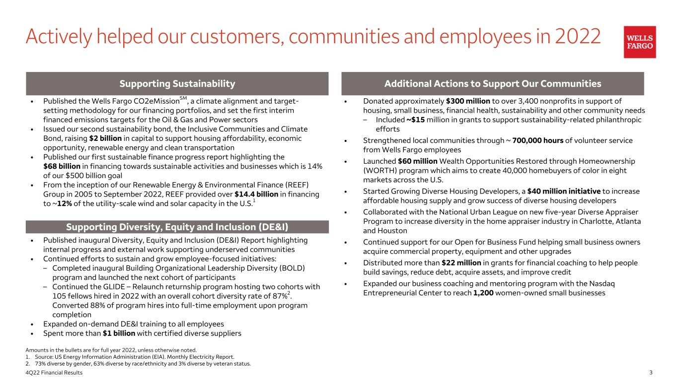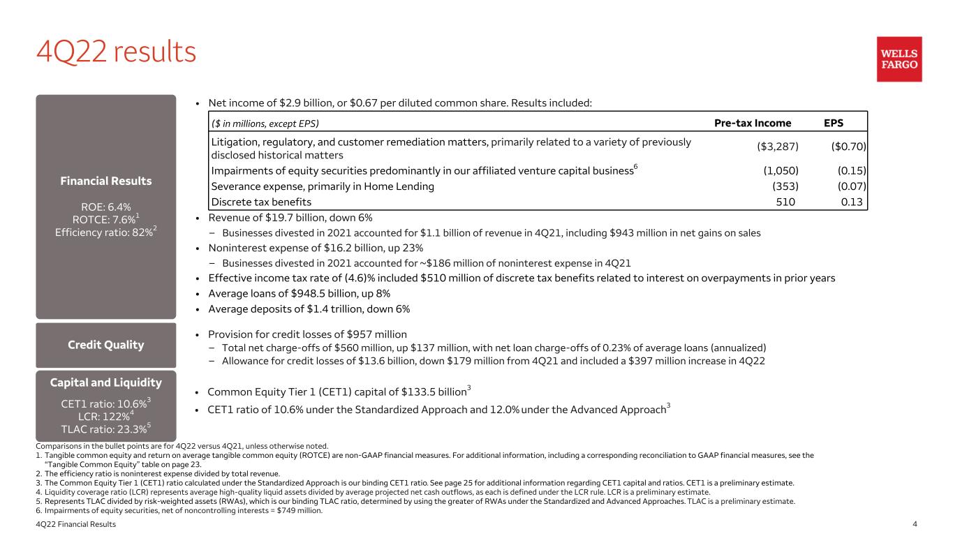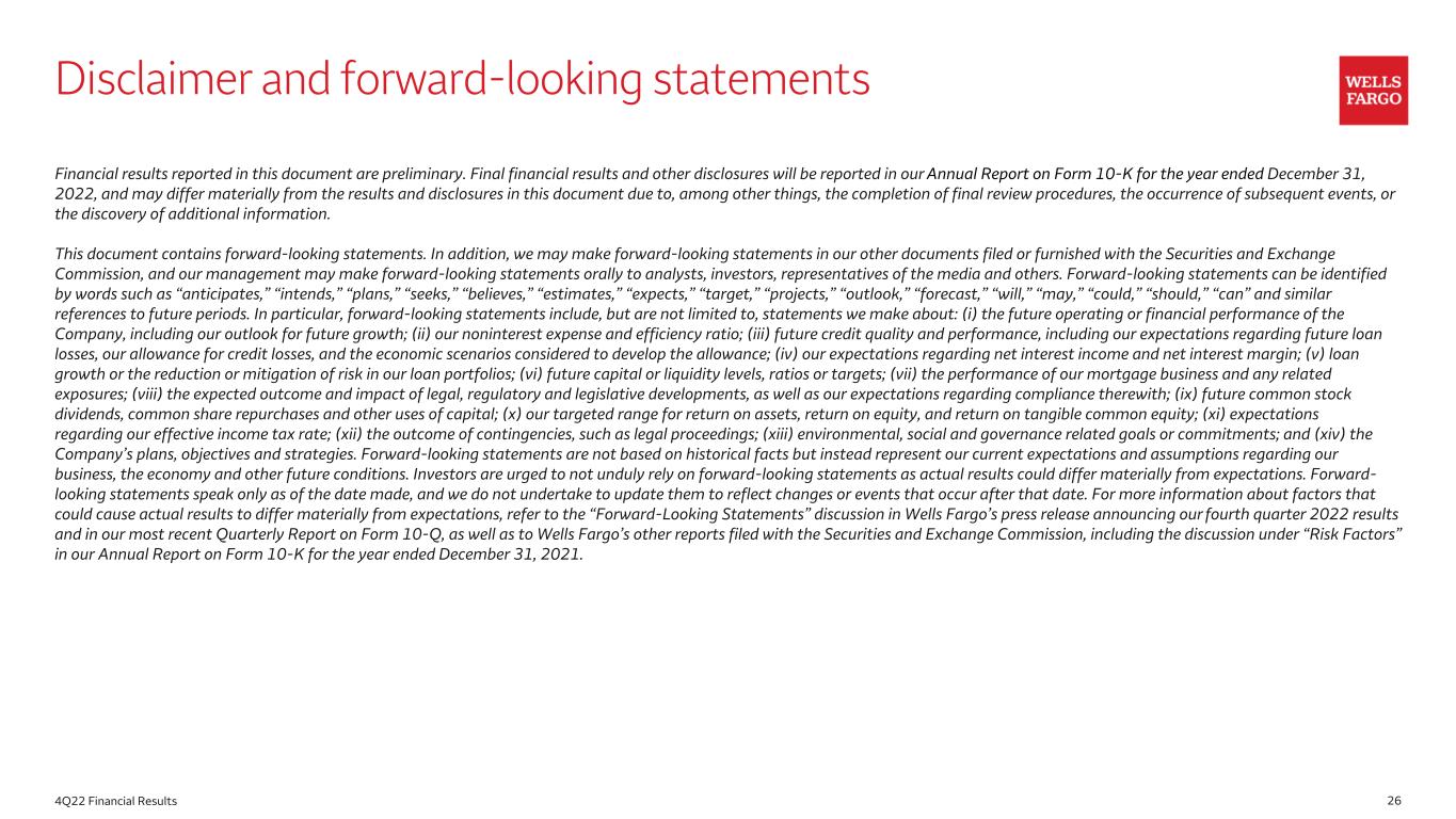264Q22 Financial Results Disclaimer and forward-looking statements Financial results reported in this document are preliminary. Final financial results and other disclosures will be reported in our Annual Report on Form 10-K for the year ended December 31, 2022, and may differ materially from the results and disclosures in this document due to, among other things, the completion of final review procedures, the occurrence of subsequent events, or the discovery of additional information. This document contains forward-looking statements. In addition, we may make forward-looking statements in our other documents filed or furnished with the Securities and Exchange Commission, and our management may make forward-looking statements orally to analysts, investors, representatives of the media and others. Forward-looking statements can be identified by words such as “anticipates,” “intends,” “plans,” “seeks,” “believes,” “estimates,” “expects,” “target,” “projects,” “outlook,” “forecast,” “will,” “may,” “could,” “should,” “can” and similar references to future periods. In particular, forward-looking statements include, but are not limited to, statements we make about: (i) the future operating or financial performance of the Company, including our outlook for future growth; (ii) our noninterest expense and efficiency ratio; (iii) future credit quality and performance, including our expectations regarding future loan losses, our allowance for credit losses, and the economic scenarios considered to develop the allowance; (iv) our expectations regarding net interest income and net interest margin; (v) loan growth or the reduction or mitigation of risk in our loan portfolios; (vi) future capital or liquidity levels, ratios or targets; (vii) the performance of our mortgage business and any related exposures; (viii) the expected outcome and impact of legal, regulatory and legislative developments, as well as our expectations regarding compliance therewith; (ix) future common stock dividends, common share repurchases and other uses of capital; (x) our targeted range for return on assets, return on equity, and return on tangible common equity; (xi) expectations regarding our effective income tax rate; (xii) the outcome of contingencies, such as legal proceedings; (xiii) environmental, social and governance related goals or commitments; and (xiv) the Company’s plans, objectives and strategies. Forward-looking statements are not based on historical facts but instead represent our current expectations and assumptions regarding our business, the economy and other future conditions. Investors are urged to not unduly rely on forward-looking statements as actual results could differ materially from expectations. Forward- looking statements speak only as of the date made, and we do not undertake to update them to reflect changes or events that occur after that date. For more information about factors that could cause actual results to differ materially from expectations, refer to the “Forward-Looking Statements” discussion in Wells Fargo’s press release announcing our fourth quarter 2022 results and in our most recent Quarterly Report on Form 10-Q, as well as to Wells Fargo’s other reports filed with the Securities and Exchange Commission, including the discussion under “Risk Factors” in our Annual Report on Form 10-K for the year ended December 31, 2021.