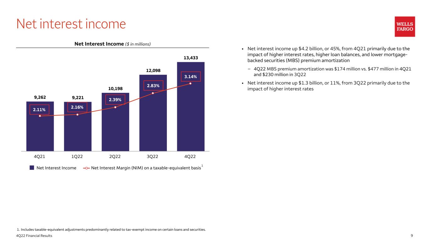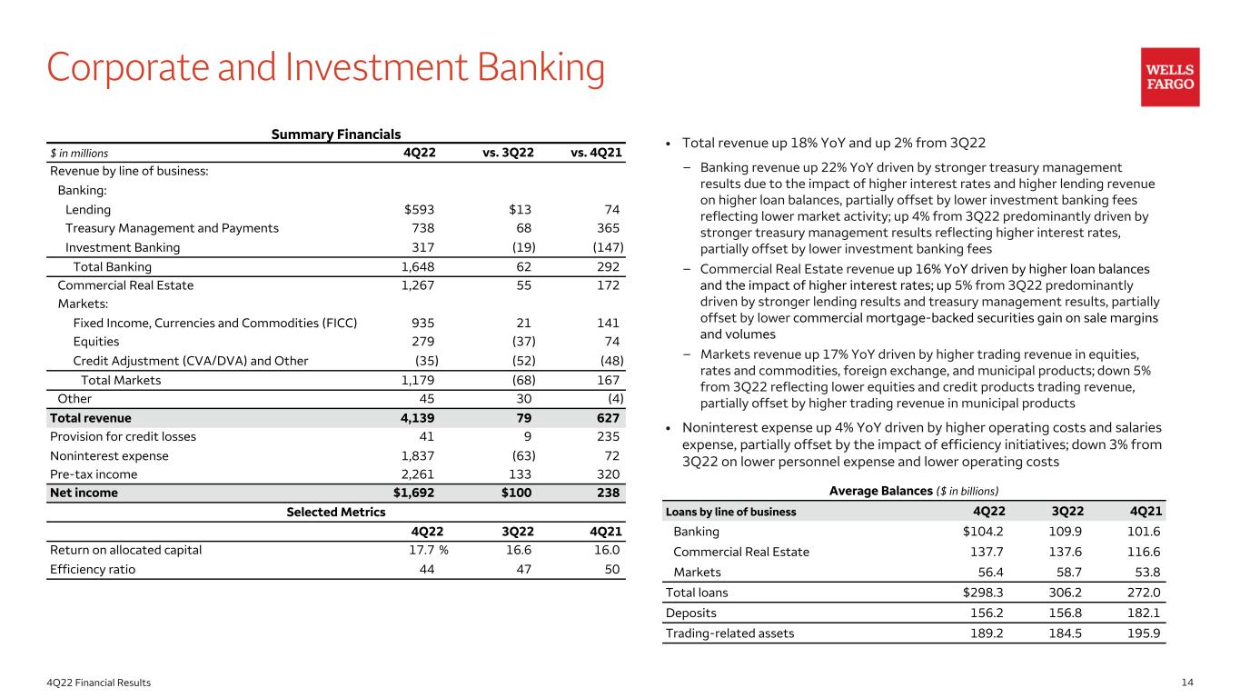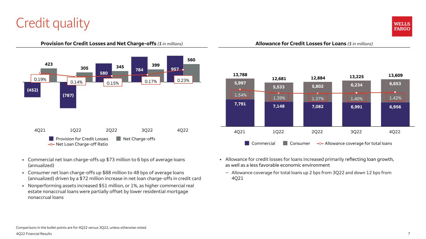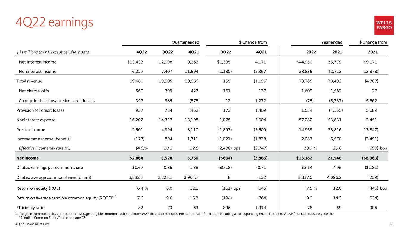 264Q22 Financial Results Disclaimer and forward-looking statements Financial results reported in this document are preliminary. Final financial results and other disclosures will be reported in our Annual Report on Form 10-K for the year ended December 31, 2022, and may differ materially from the results and disclosures in this document due to, among other things, the completion of final review procedures, the occurrence of subsequent events, or the discovery of additional information. This document contains forward-looking statements. In addition, we may make forward-looking statements in our other documents filed or furnished with the Securities and Exchange Commission, and our management may make forward-looking statements orally to analysts, investors, representatives of the media and others. Forward-looking statements can be identified by words such as “anticipates,” “intends,” “plans,” “seeks,” “believes,” “estimates,” “expects,” “target,” “projects,” “outlook,” “forecast,” “will,” “may,” “could,” “should,” “can” and similar references to future periods. In particular, forward-looking statements include, but are not limited to, statements we make about: (i) the future operating or financial performance of the Company, including our outlook for future growth; (ii) our noninterest expense and efficiency ratio; (iii) future credit quality and performance, including our expectations regarding future loan losses, our allowance for credit losses, and the economic scenarios considered to develop the allowance; (iv) our expectations regarding net interest income and net interest margin; (v) loan growth or the reduction or mitigation of risk in our loan portfolios; (vi) future capital or liquidity levels, ratios or targets; (vii) the performance of our mortgage business and any related exposures; (viii) the expected outcome and impact of legal, regulatory and legislative developments, as well as our expectations regarding compliance therewith; (ix) future common stock dividends, common share repurchases and other uses of capital; (x) our targeted range for return on assets, return on equity, and return on tangible common equity; (xi) expectations regarding our effective income tax rate; (xii) the outcome of contingencies, such as legal proceedings; (xiii) environmental, social and governance related goals or commitments; and (xiv) the Company’s plans, objectives and strategies. Forward-looking statements are not based on historical facts but instead represent our current expectations and assumptions regarding our business, the economy and other future conditions. Investors are urged to not unduly rely on forward-looking statements as actual results could differ materially from expectations. Forward- looking statements speak only as of the date made, and we do not undertake to update them to reflect changes or events that occur after that date. For more information about factors that could cause actual results to differ materially from expectations, refer to the “Forward-Looking Statements” discussion in Wells Fargo’s press release announcing our fourth quarter 2022 results and in our most recent Quarterly Report on Form 10-Q, as well as to Wells Fargo’s other reports filed with the Securities and Exchange Commission, including the discussion under “Risk Factors” in our Annual Report on Form 10-K for the year ended December 31, 2021.
