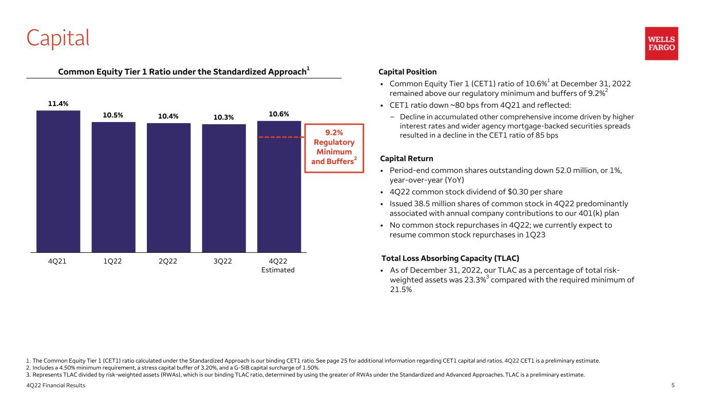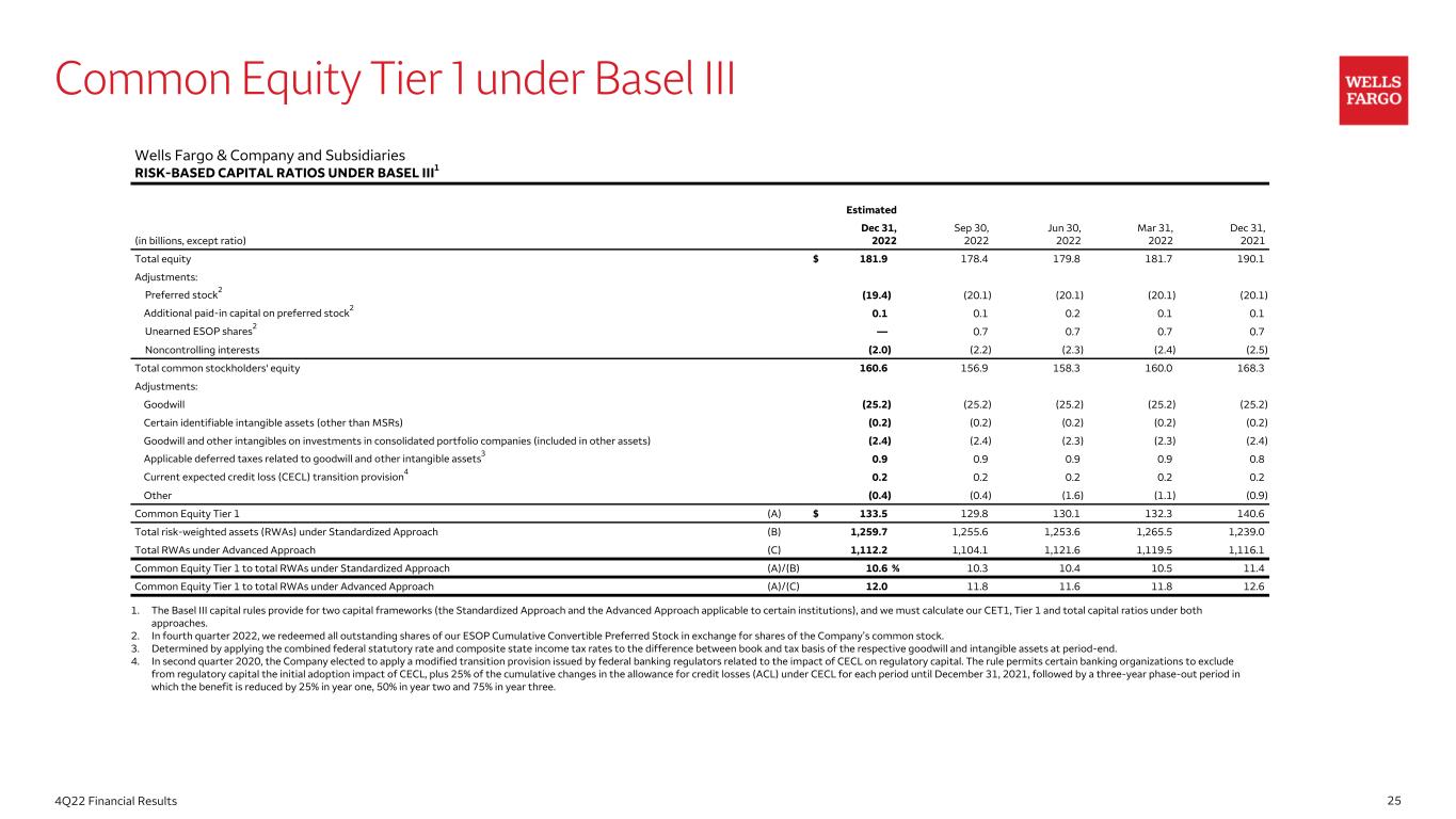 254Q22 Financial Results 1. The Basel III capital rules provide for two capital frameworks (the Standardized Approach and the Advanced Approach applicable to certain institutions), and we must calculate our CET1, Tier 1 and total capital ratios under both approaches. 2. In fourth quarter 2022, we redeemed all outstanding shares of our ESOP Cumulative Convertible Preferred Stock in exchange for shares of the Company’s common stock. 3. Determined by applying the combined federal statutory rate and composite state income tax rates to the difference between book and tax basis of the respective goodwill and intangible assets at period-end. 4. In second quarter 2020, the Company elected to apply a modified transition provision issued by federal banking regulators related to the impact of CECL on regulatory capital. The rule permits certain banking organizations to exclude from regulatory capital the initial adoption impact of CECL, plus 25% of the cumulative changes in the allowance for credit losses (ACL) under CECL for each period until December 31, 2021, followed by a three-year phase-out period in which the benefit is reduced by 25% in year one, 50% in year two and 75% in year three. Common Equity Tier 1 under Basel III Wells Fargo & Company and Subsidiaries RISK-BASED CAPITAL RATIOS UNDER BASEL III1 Estimated (in billions, except ratio) Dec 31, 2022 Sep 30, 2022 Jun 30, 2022 Mar 31, 2022 Dec 31, 2021 Total equity $ 181.9 178.4 179.8 181.7 190.1 Adjustments: Preferred stock2 (19.4) (20.1) (20.1) (20.1) (20.1) Additional paid-in capital on preferred stock2 0.1 0.1 0.2 0.1 0.1 Unearned ESOP shares2 — 0.7 0.7 0.7 0.7 Noncontrolling interests (2.0) (2.2) (2.3) (2.4) (2.5) Total common stockholders' equity 160.6 156.9 158.3 160.0 168.3 Adjustments: Goodwill (25.2) (25.2) (25.2) (25.2) (25.2) Certain identifiable intangible assets (other than MSRs) (0.2) (0.2) (0.2) (0.2) (0.2) Goodwill and other intangibles on investments in consolidated portfolio companies (included in other assets) (2.4) (2.4) (2.3) (2.3) (2.4) Applicable deferred taxes related to goodwill and other intangible assets3 0.9 0.9 0.9 0.9 0.8 Current expected credit loss (CECL) transition provision4 0.2 0.2 0.2 0.2 0.2 Other (0.4) (0.4) (1.6) (1.1) (0.9) Common Equity Tier 1 (A) $ 133.5 129.8 130.1 132.3 140.6 Total risk-weighted assets (RWAs) under Standardized Approach (B) 1,259.7 1,255.6 1,253.6 1,265.5 1,239.0 Total RWAs under Advanced Approach (C) 1,112.2 1,104.1 1,121.6 1,119.5 1,116.1 Common Equity Tier 1 to total RWAs under Standardized Approach (A)/(B) 10.6 % 10.3 10.4 10.5 11.4 Common Equity Tier 1 to total RWAs under Advanced Approach (A)/(C) 12.0 11.8 11.6 11.8 12.6