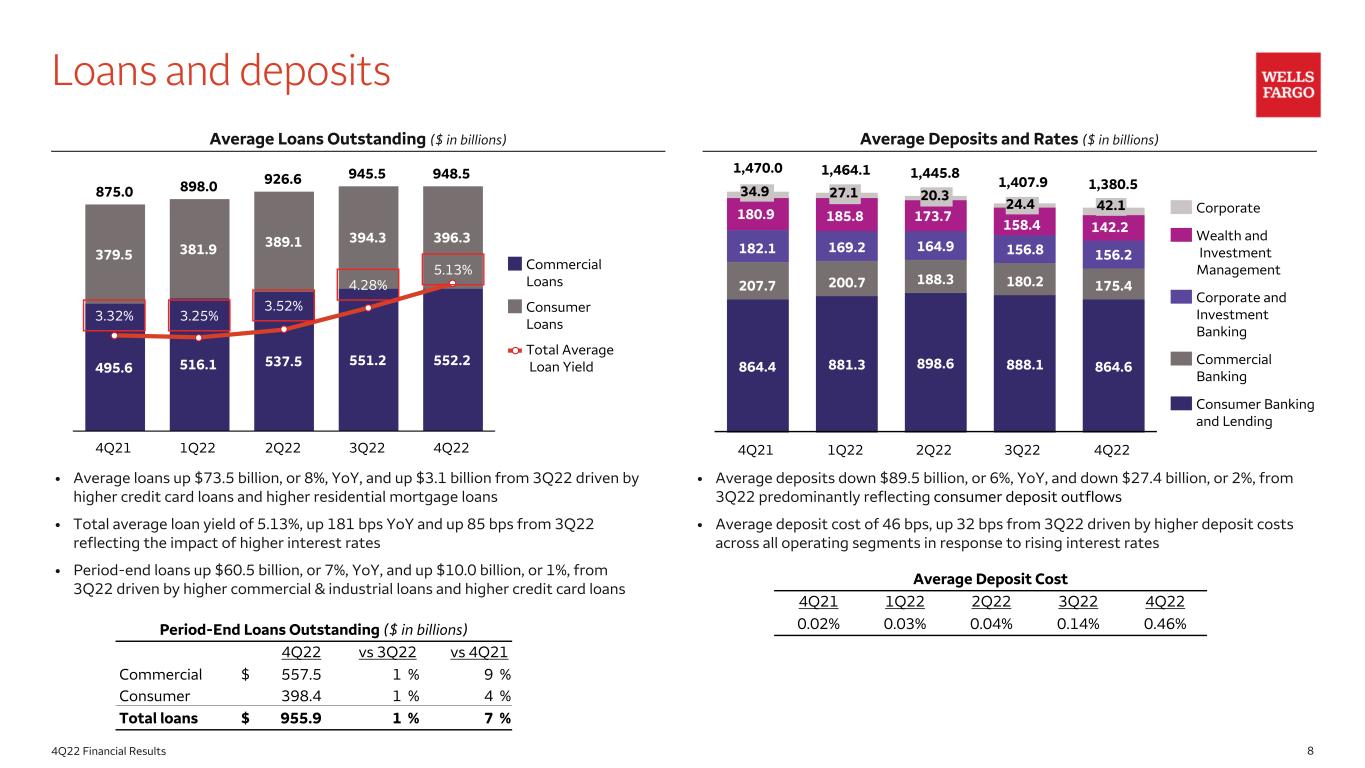 84Q22 Financial Results Loans and deposits • Average loans up $73.5 billion, or 8%, YoY, and up $3.1 billion from 3Q22 driven by higher credit card loans and higher residential mortgage loans • Total average loan yield of 5.13%, up 181 bps YoY and up 85 bps from 3Q22 reflecting the impact of higher interest rates • Period-end loans up $60.5 billion, or 7%, YoY, and up $10.0 billion, or 1%, from 3Q22 driven by higher commercial & industrial loans and higher credit card loans • Average deposits down $89.5 billion, or 6%, YoY, and down $27.4 billion, or 2%, from 3Q22 predominantly reflecting consumer deposit outflows • Average deposit cost of 46 bps, up 32 bps from 3Q22 driven by higher deposit costs across all operating segments in response to rising interest rates Average Loans Outstanding ($ in billions) Average Deposits and Rates ($ in billions) 875.0 898.0 926.6 945.5 948.5 495.6 516.1 537.5 551.2 552.2 379.5 381.9 389.1 394.3 396.3 Commercial Loans Consumer Loans Total Average Loan Yield 4Q21 1Q22 2Q22 3Q22 4Q22 864.4 881.3 898.6 888.1 864.6 207.7 200.7 188.3 180.2 175.4 182.1 169.2 164.9 156.8 156.2 Corporate Wealth and Investment Management Corporate and Investment Banking Commercial Banking Consumer Banking and Lending 4Q21 1Q22 2Q22 3Q22 4Q22 3.32% 3.25% 3.52% 4.28% 5.13% Average Deposit Cost 4Q21 1Q22 2Q22 3Q22 4Q22 0.02% 0.03% 0.04% 0.14% 0.46% 42.124.420.327.134.9 Period-End Loans Outstanding ($ in billions) 4Q22 vs 3Q22 vs 4Q21 Commercial $ 557.5 1 % 9 % Consumer 398.4 1 % 4 % Total loans $ 955.9 1 % 7 % 180.9 158.4 142.2 173.7185.8 1,470.0 1,464.1 1,445.8 1,407.9 1,380.5